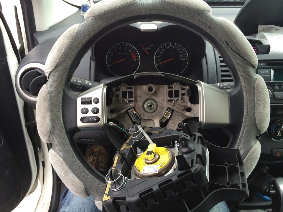 Откручиваем гайку, но не до конца. Запоминаем положение руля (вообще там есть метка, но она чуть криво стоит — Nissan же). Ииии… дергаем руль на себя несколько раз. Гайку не откручивали, чтобы руль в лоб не прилетел. Я первый раз открутил полностью и хорошо что я не смог его снять сразу, а то нос разбил бы.