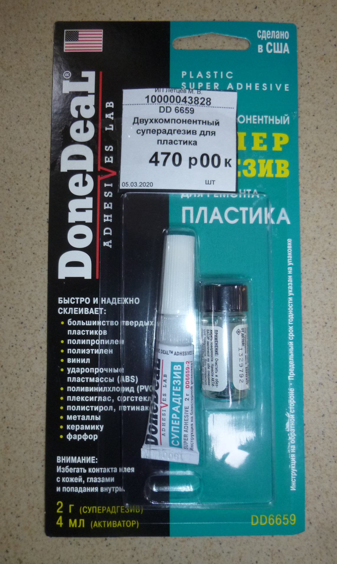 Почитав бортжурналы на "Драйве" решил, что это можно в лёгкую починить. Фару просушил и заказал клей Done Deal (арт. DD6659), двухкомпонентный супер адгезив для ремонта пластика.