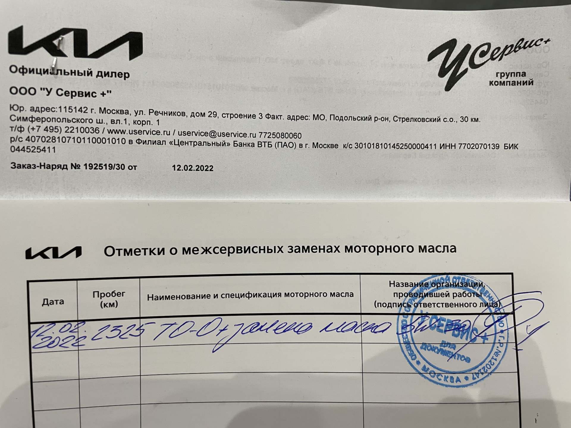 Включало в себя замену моторного масла и фильтра, а также прокладки сливного болта. Проводили 12.02.2022 там же, где и приобретали автомобиль — УСервис+ на Симферопольском шоссе (г. Подольск, МО). По купону от менеджера работы производились бесплатно, оплата была только запчастей. Итого: 3800 р., пробег был 2325 км.