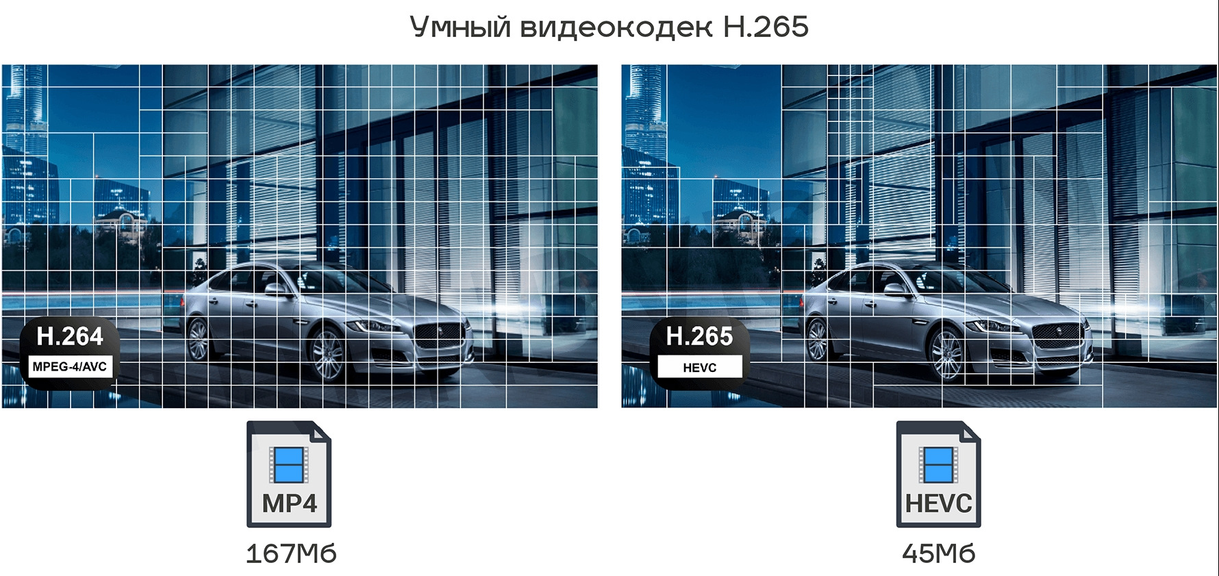 Поддерживает как классический кодек H.264 (формат MP4), так и умный видеокодек нового поколения H.265 (формат HEVC), который значительно сжимает размеры итоговых видеофайлов (до 30% экономии места на карте памяти), сохраняя при этом качество изображения.