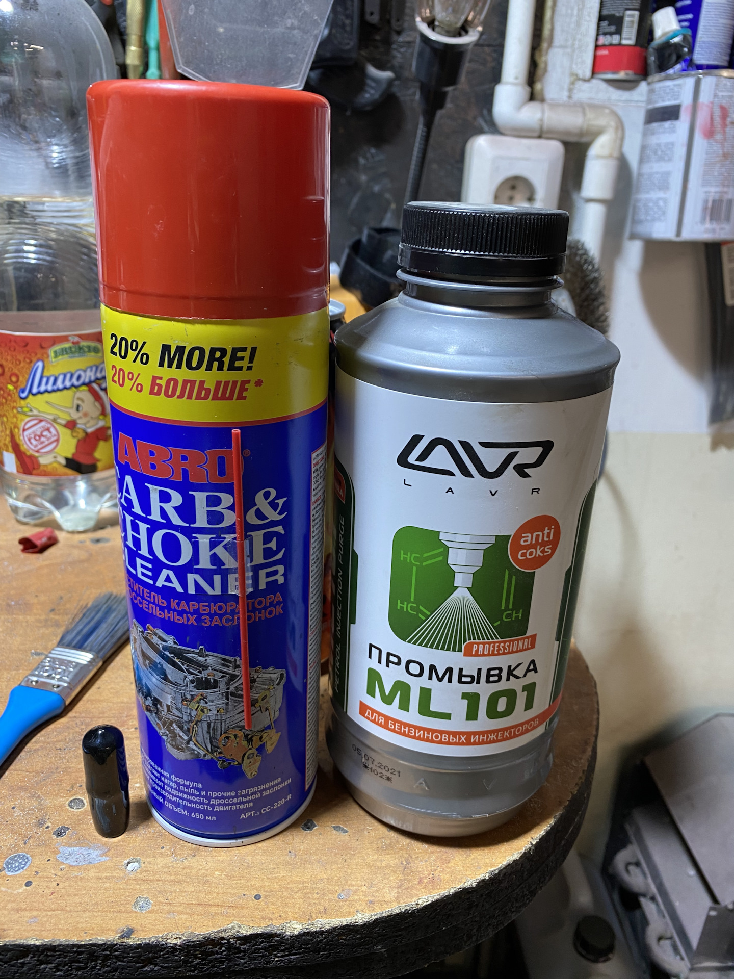 Взяв очиститель дроссельной заслонки и кисточку начал его чистить.