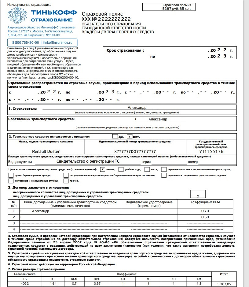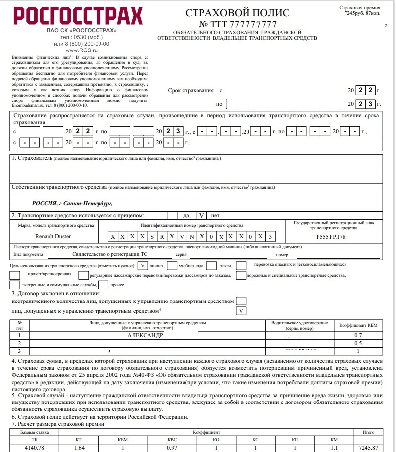 1) Осаго для дорестайлинга (90 л.с.) родственника с КБМ 1.0 (то есть без понижающего коэффициента)- 7245.87 руб — скидка 505 руб = 6 740,87 руб.