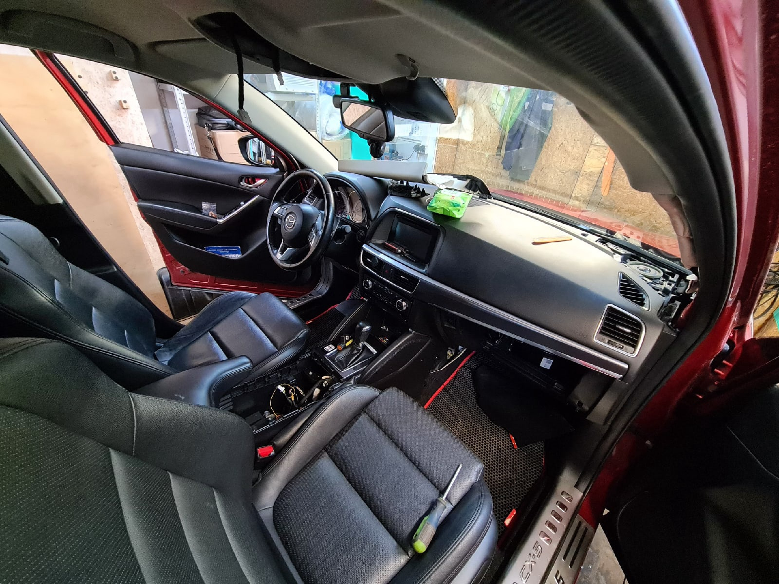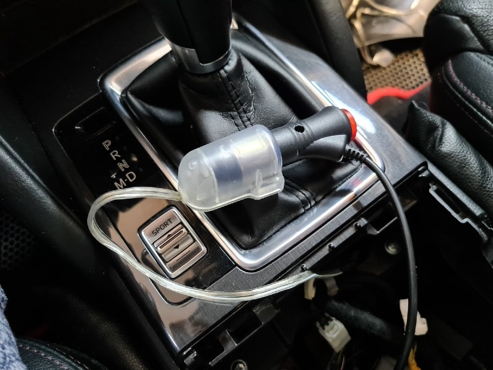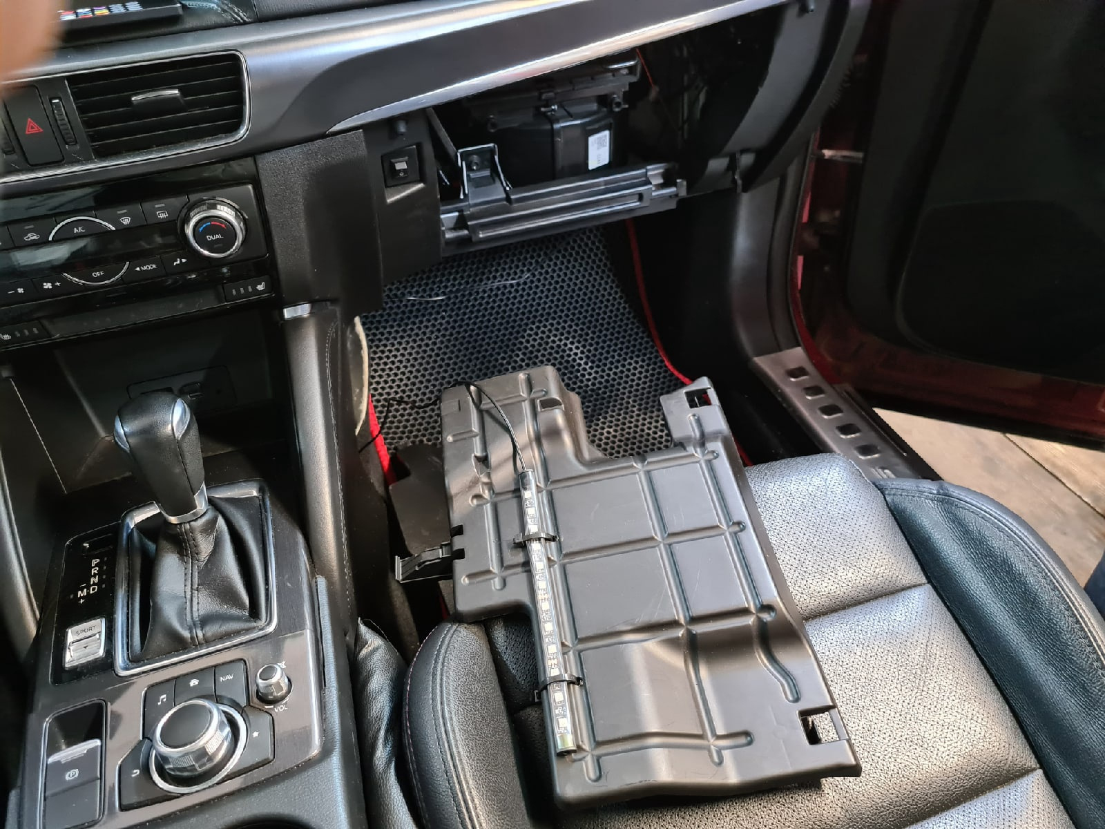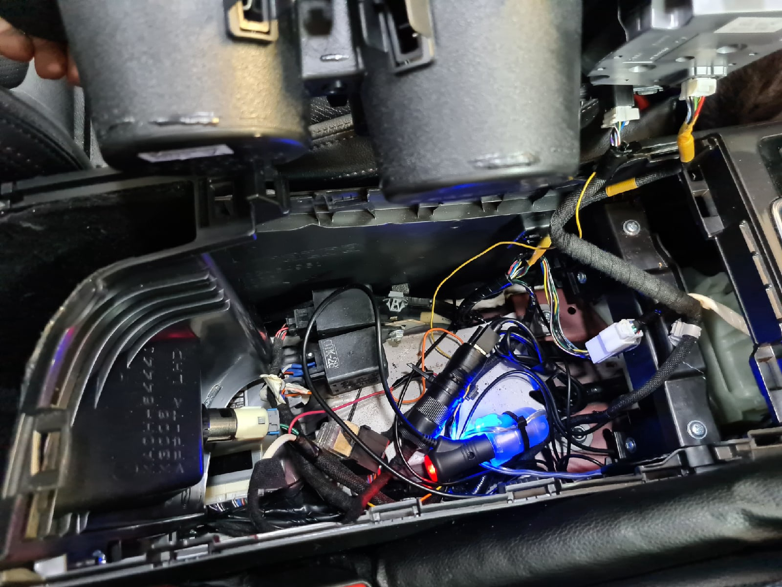 — снял бардачок, за ним провел провода и вытащил их уже в подлокотник. Весь подлокотник не снимал, не откручивал, всё просунул так. Открывал (сдернул вверх) только верхнюю часть где шайба и кнопка спорт.