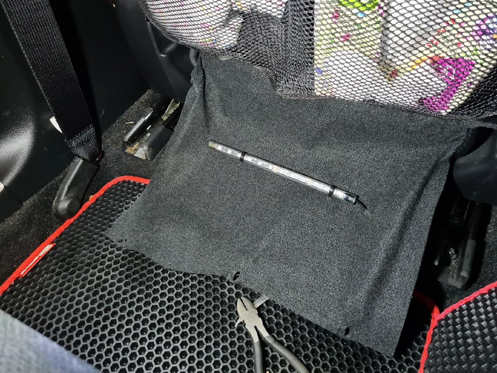 Управляющий блок подсветкой обладает хвостиком на котором стоит приемник для сигналов с пульта, поэтому блок поставил справа так, что хвостик торчит снизу туннеля у пассажира. Не видно и функционирует нормально, а учитывая что пользоваться им не планирую — вообще огонь.