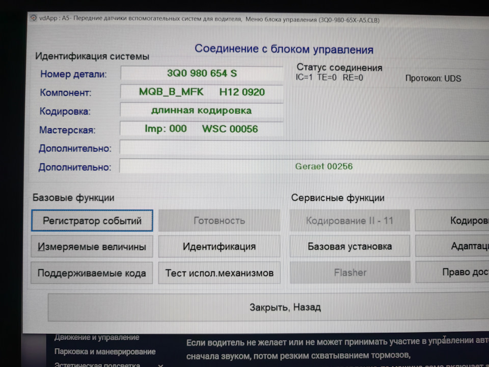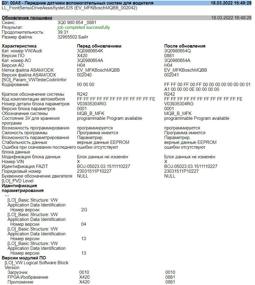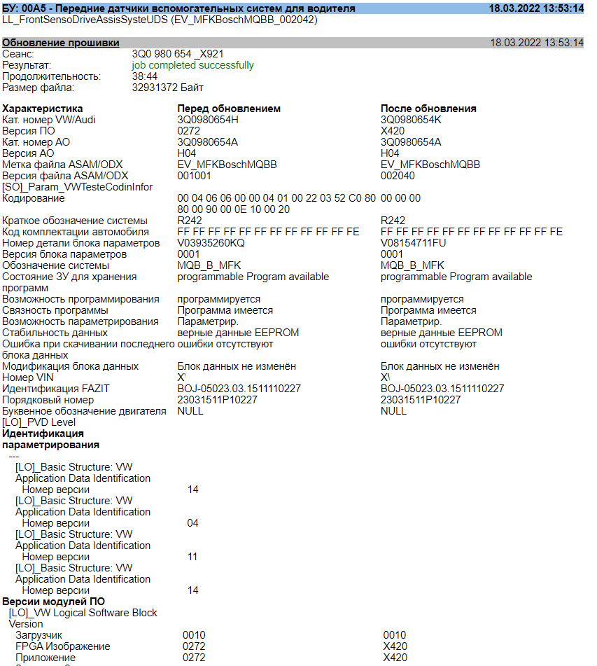 Из отчета видно, что кодировка стала снова длинной. Блок данных залил такой: 3Q0980654Q_0881_Sharan_301EU. С ним предупреждение о необходимости взять руль появляется через 45 с.