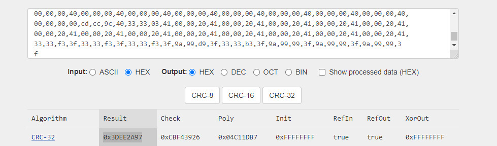 Чтобы рассчитать контрольную сумму, отбрасываем 4 последние байта и вставляем значения в любой онлайн калькулятор. На картинке видно, что выдается значение 3D EE 2A 97, инвертируем его и получает нужную нам контрольную сумму 97 2A EE 3D. Внутри общей контрольной суммы есть участки, защищенные своей контрольной суммой, если отредактировать значения, попадающие в защищенный диапазон, то блок данных не будет принят камерой.