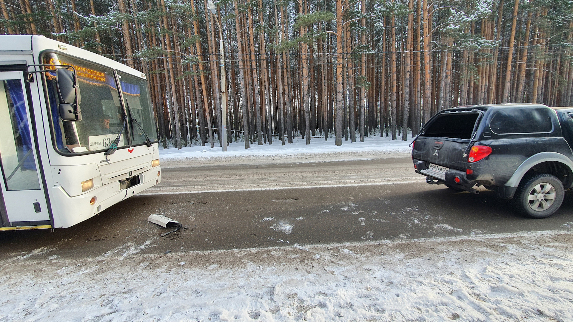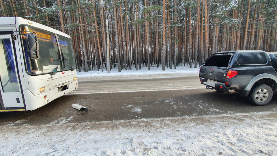 В этот момент я услышал шум торможения сзади, сигнал. Успел посмотреть в зеркало, увидел там огромный автобус, летящий на меня сзади. Успел воткнуть передачу, даже тронуться и проехать с полметра. Но автобус нагнал и бахнул сзади :( Автобусом оказался НЕФАЗ 63-го маршрута, за рулем был товарищ из дружественного Казахстана… Впереди стоящую тачку не задело, слава богу.