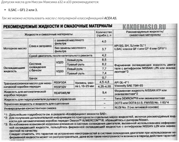 Допуски для автомобилей NISSAN CEFIRO(MAXIMA) INFINITI I30 в кузовах а32 а33 выпускавшиеся с 1994-1999, 1999-2004 г.в. API SG, SH, SJ, SL.