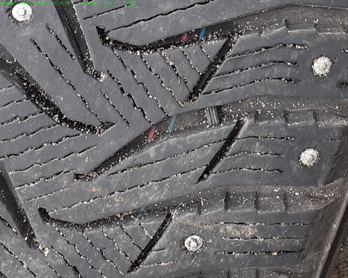Сложно сказать на сколько резина стёрлась, но шипы выглядят живыми, а изначальную глубину протектора я не знаю. По TWI судить ? достаточно ещё осталось.