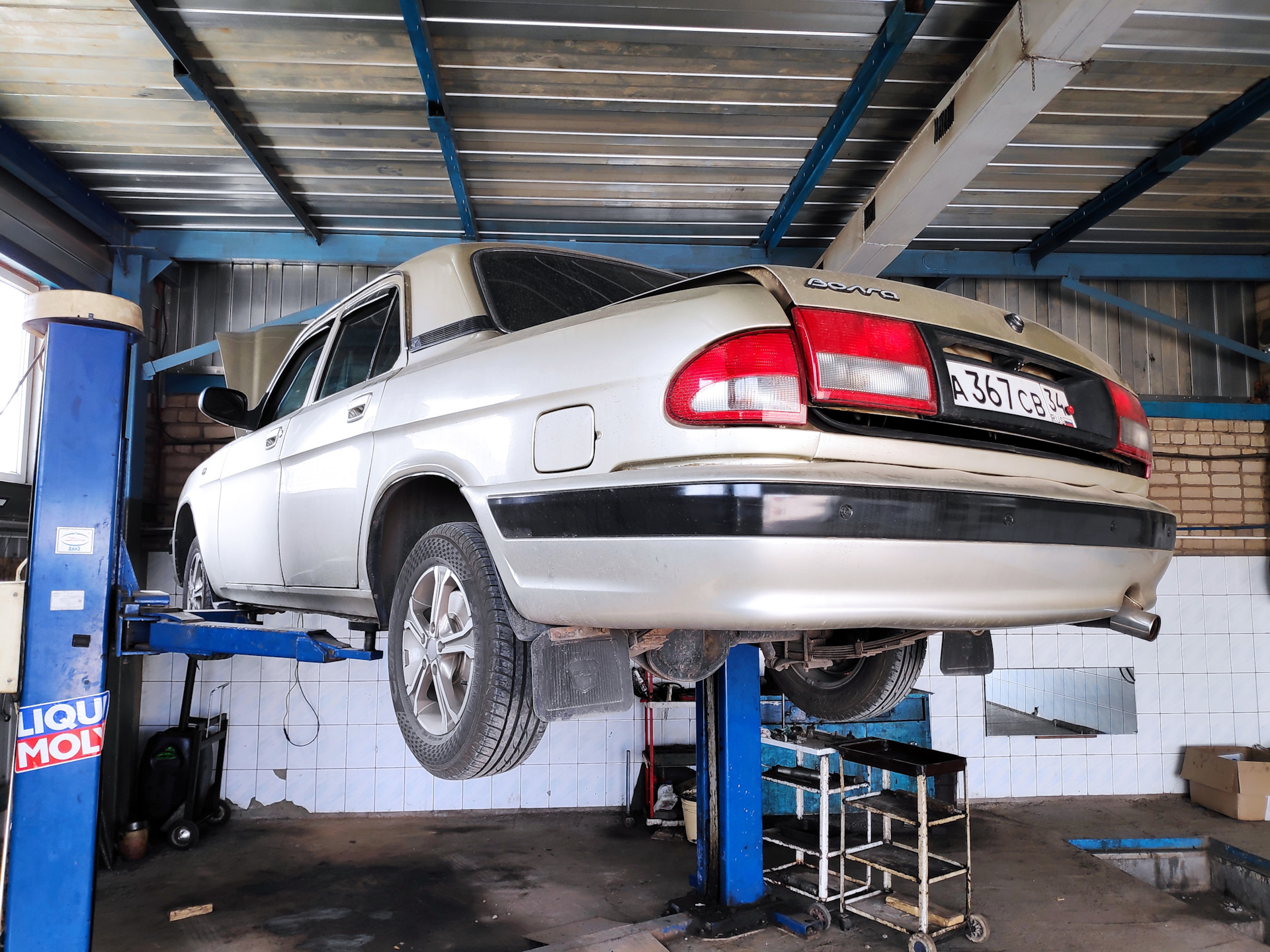 Для удобства — поднимаем машину (на улице пока прохладно). Конечно можно и лечь под неё, но земля холодная. Высота задней части у меня позволяет просто без домкрата всё сделать, но удобства почти нет.