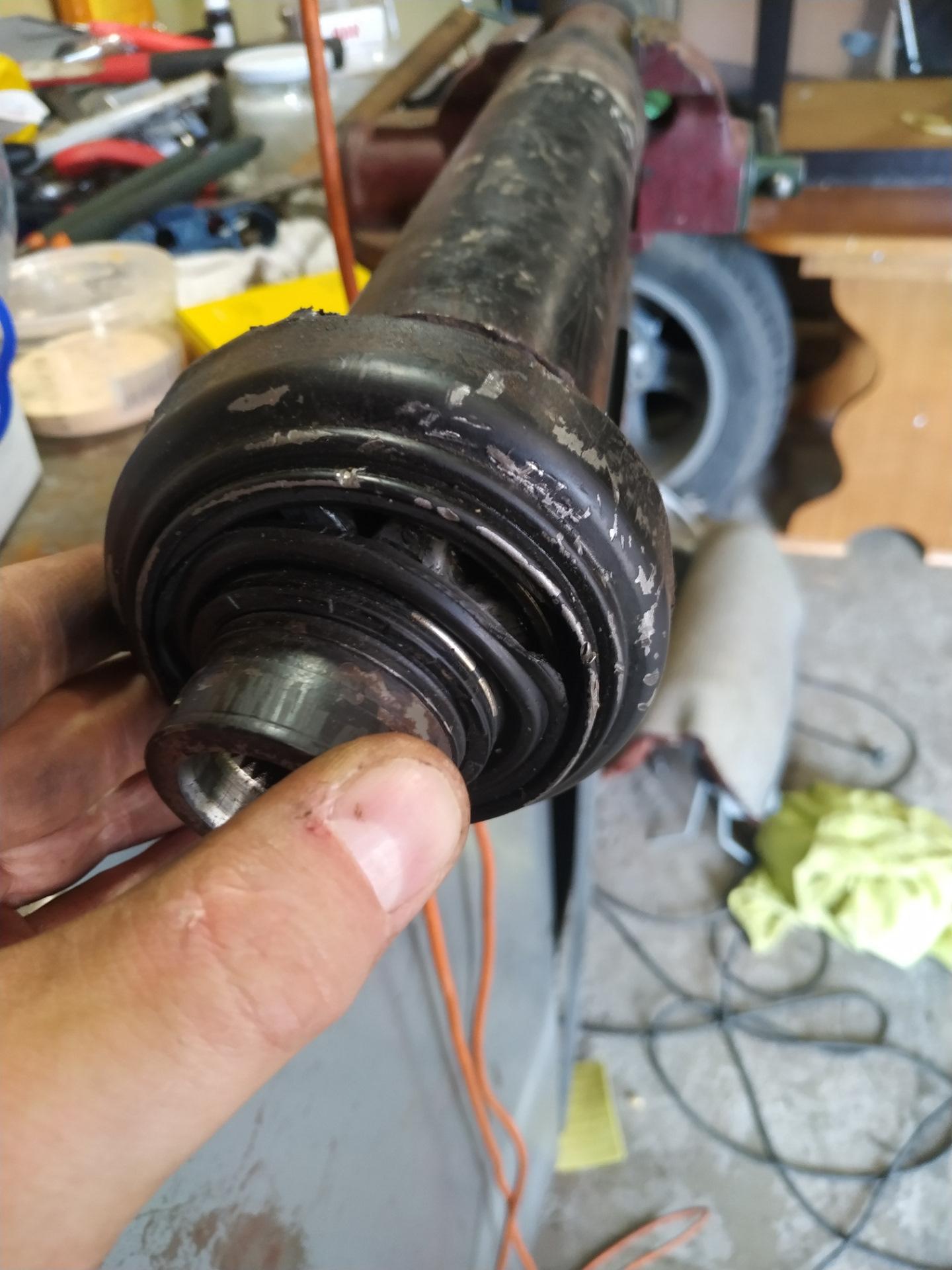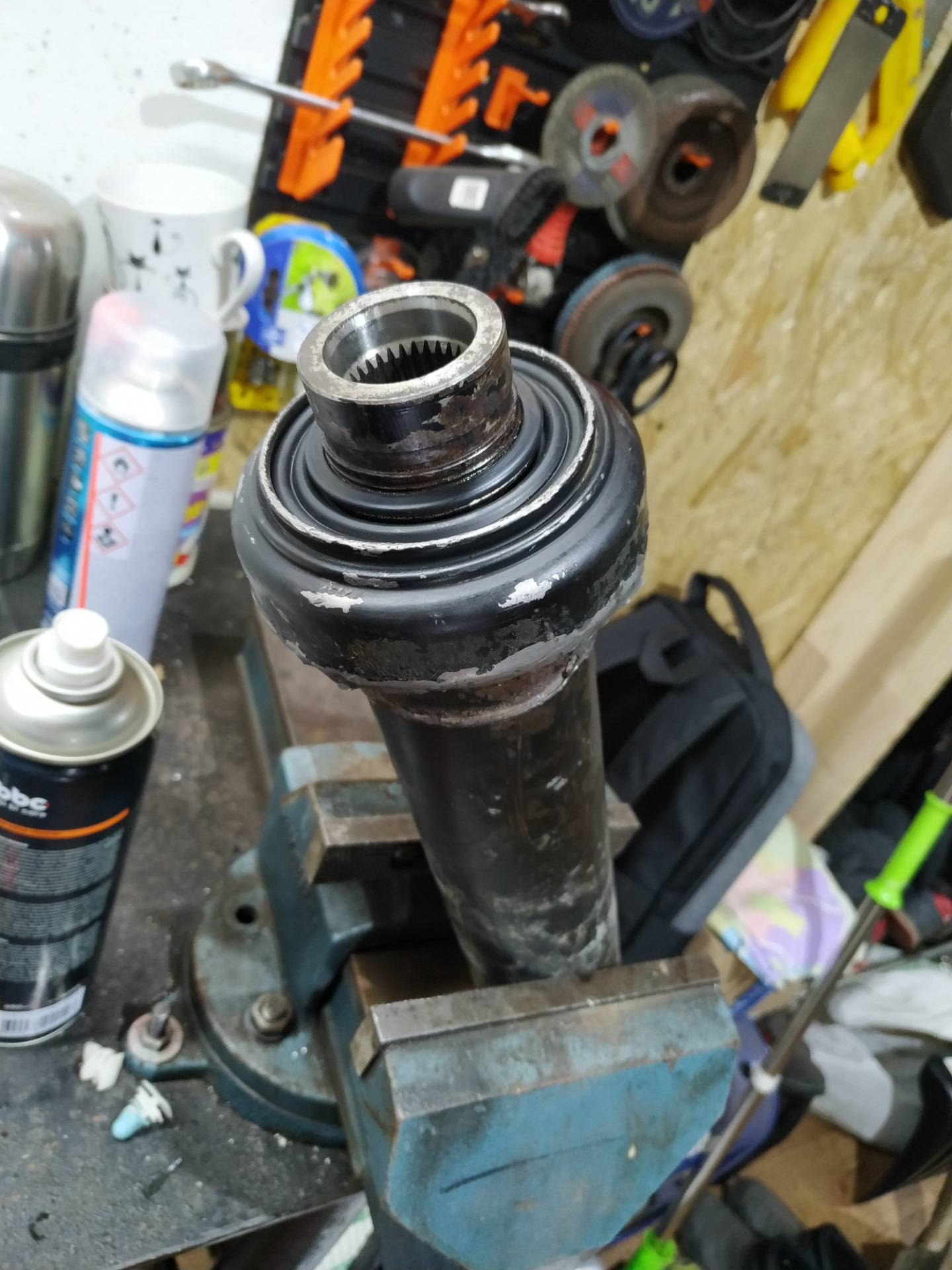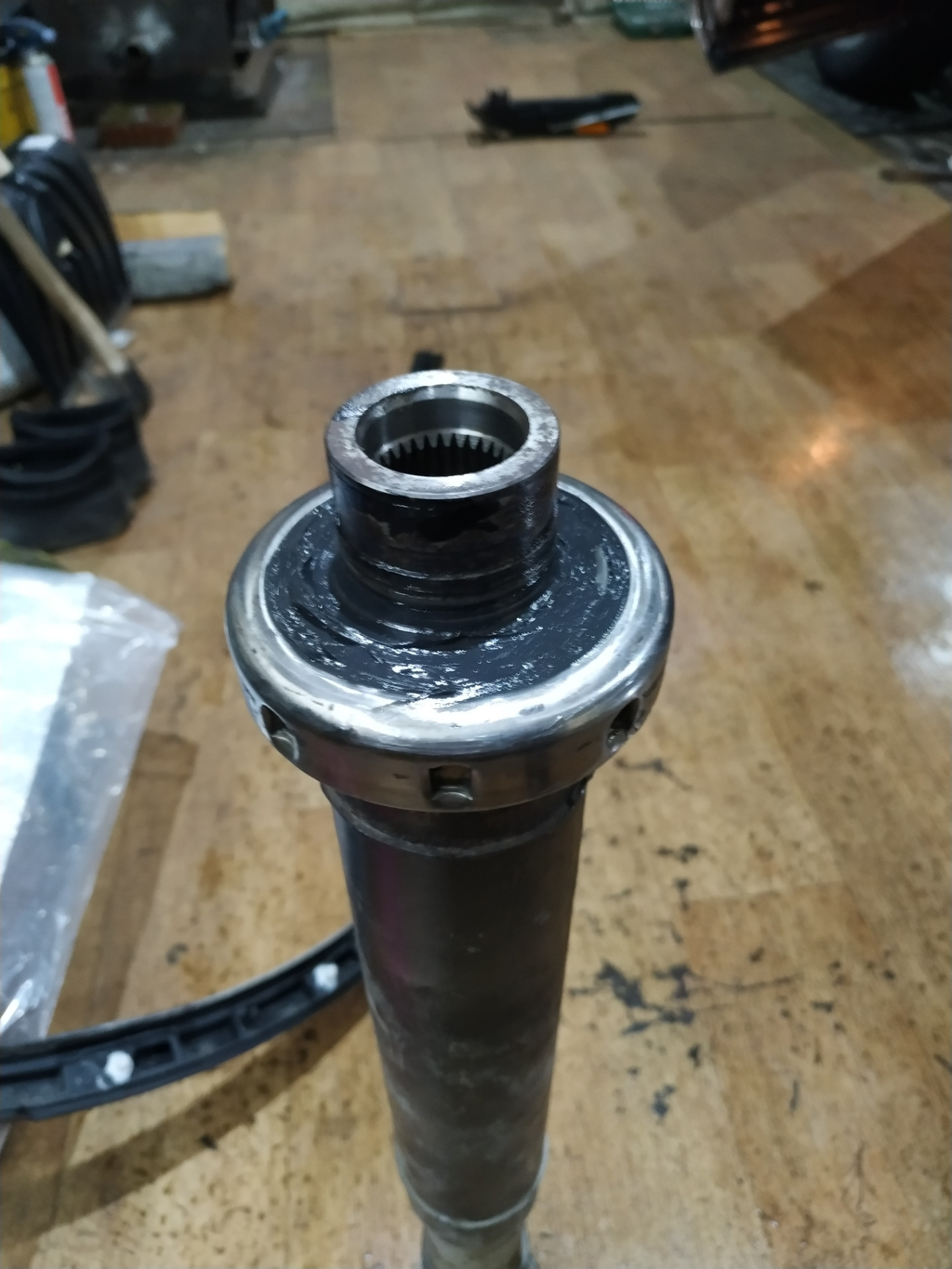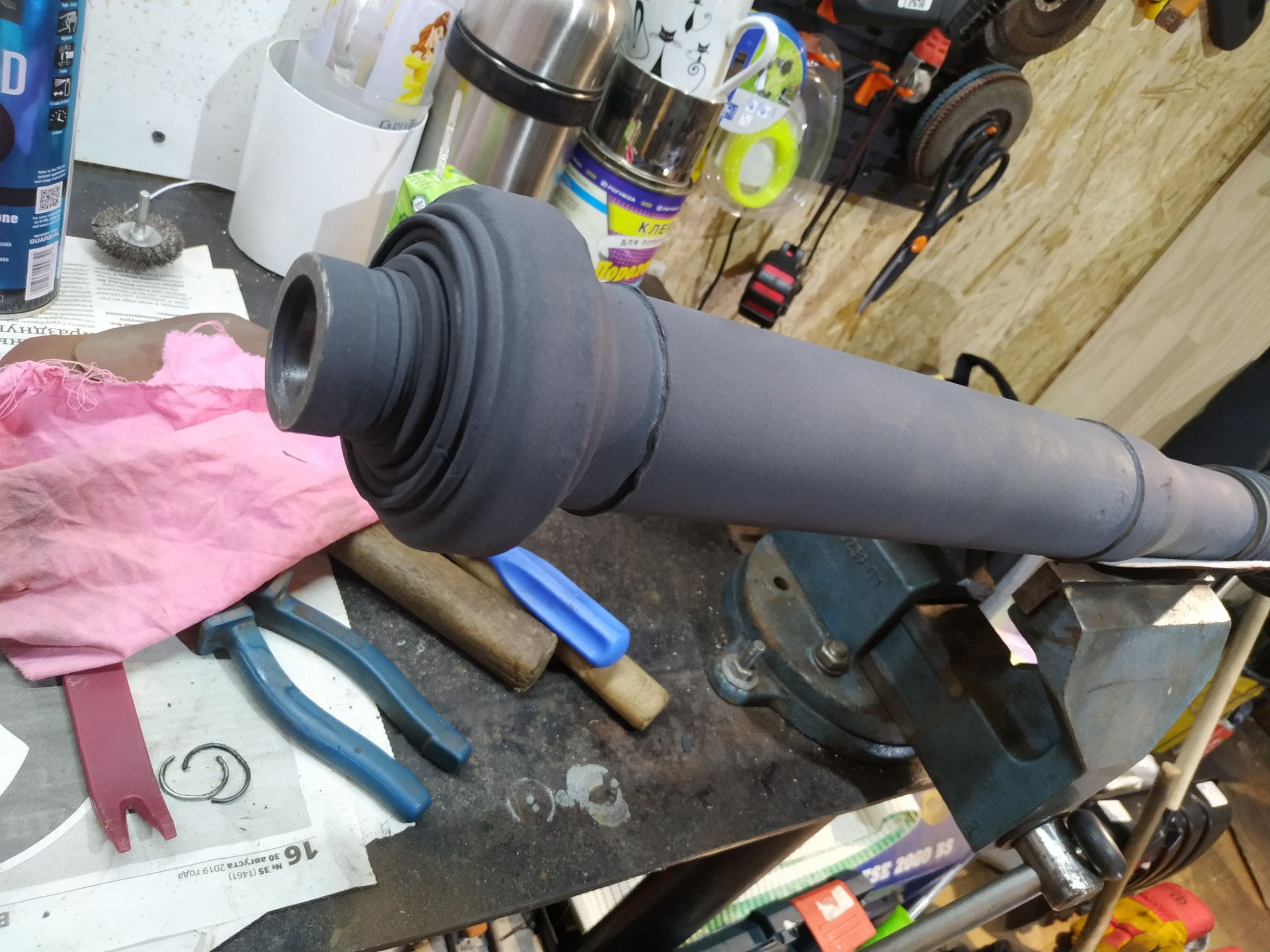 Работа по замене простая, развальцевать обойму и снять ее, снять старый пыльник с кольцом, обновить смазку, установить новый пыльник с кольцом, установить обойму и завальцевать. После освежил кардан, почти новье!