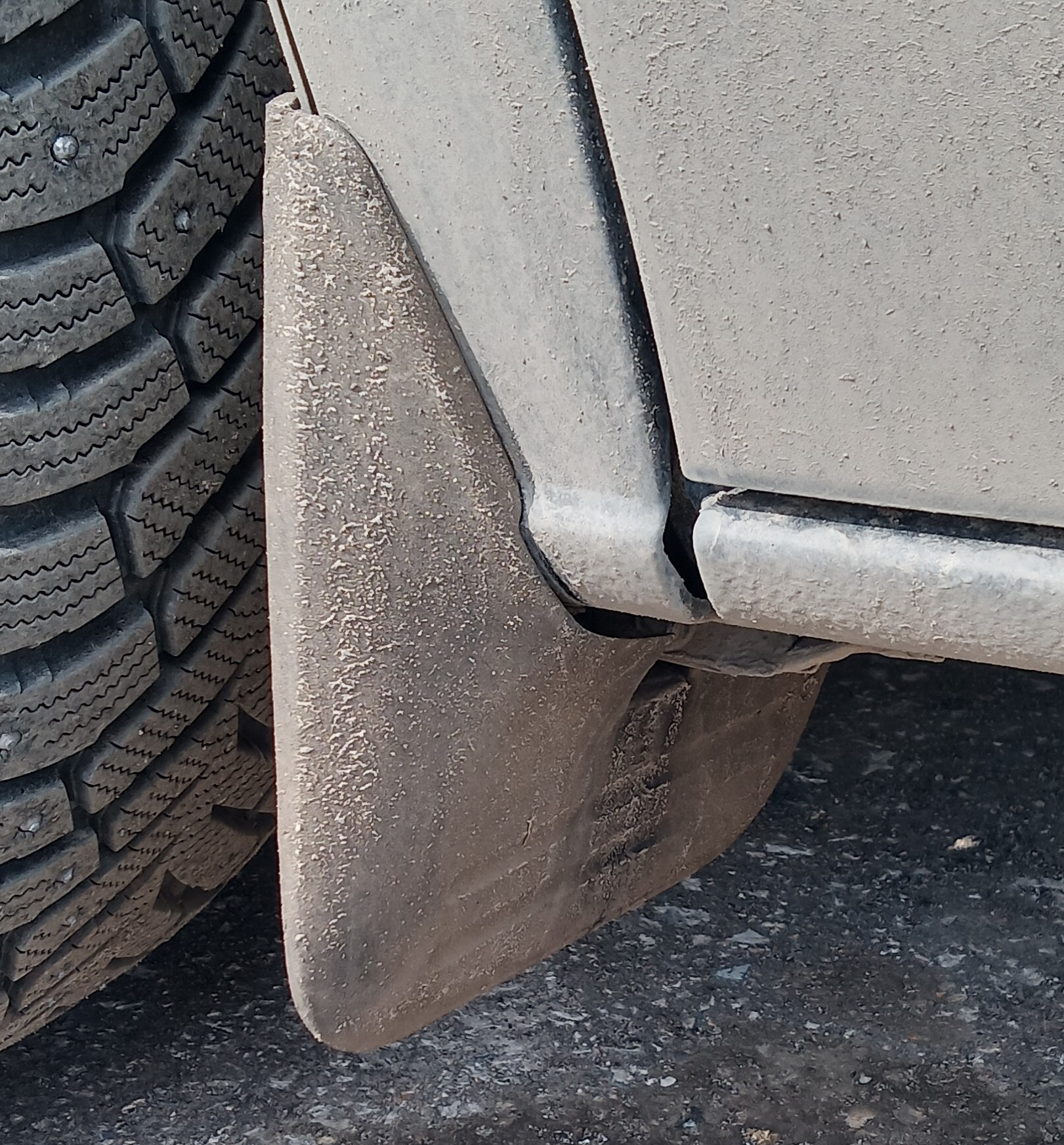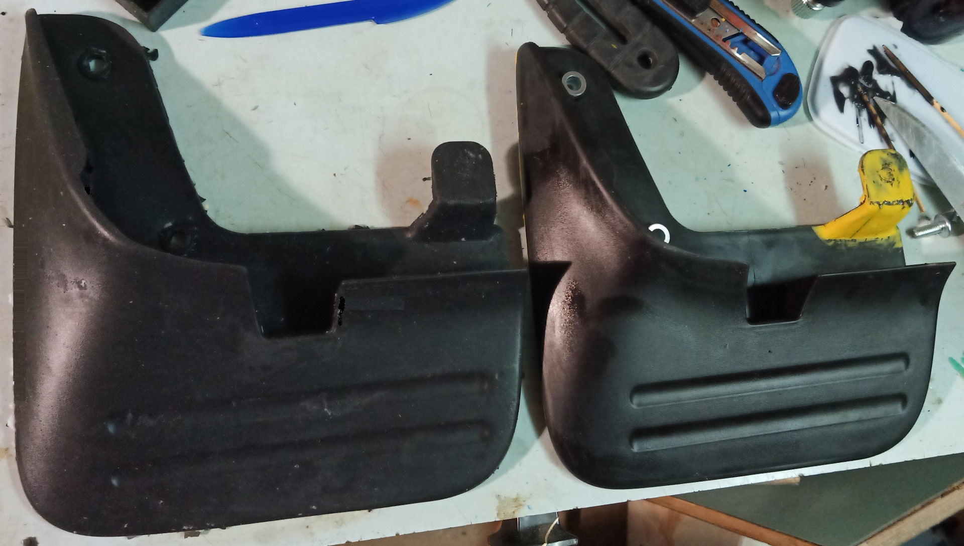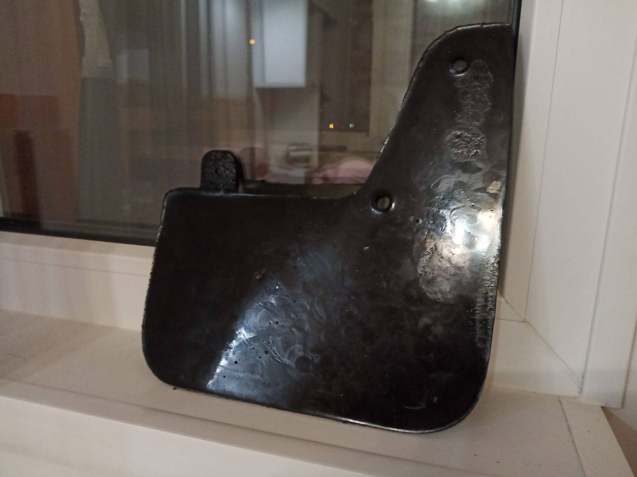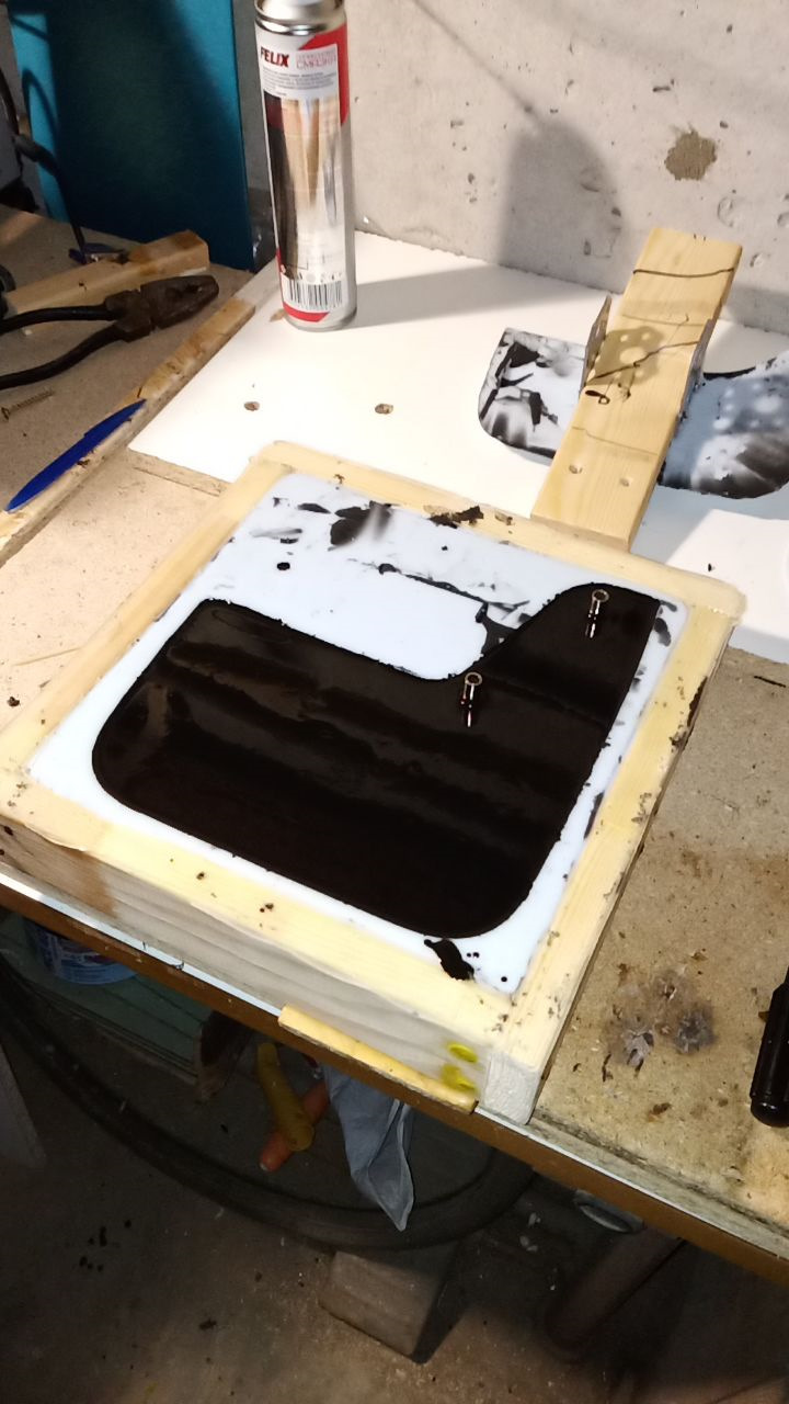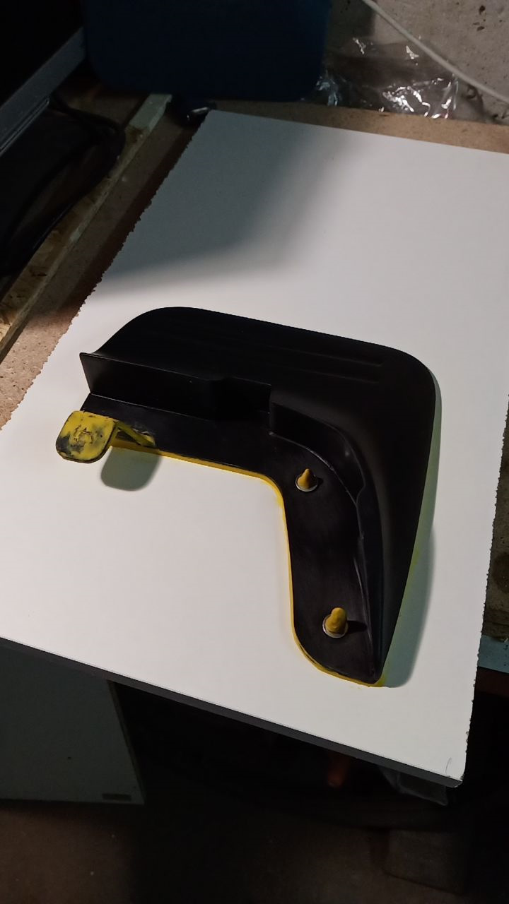 ДВС. Начну из далека. Купил машину с поломанным брызговиком, купил поставил, но счастье было не долгим. Зима, колея, снег и сугробы и его снова нет, да еще ушел с корнями (креплениями). Оригинальные пластиковые жесткие, решил как самый умный поступить и найти мягкие аналоги, брызговики из резины. Но их нет или я не нашел. Поэтому решил сделать сам, по материалу остановился на полиуретане. Не дубеют на морозе. Не ломаются при контакте с препятствием и не вырывают крепления с корнем за счет эластичности. Так же не трескаются как резиновые. Сделал с оригинальной запчасти копию, крепится в штатные места. Заколеровал в черный цвет. Результат порадовал буду делать весь комплект.