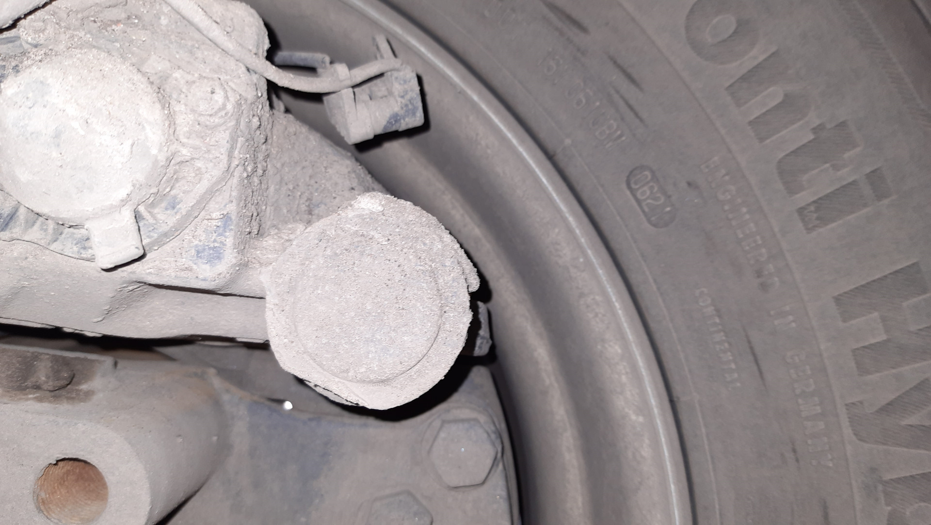 А, пока всё осматривал, на переднем-правом, нашёл оторвавшийся со своего места датчик этих самых колодок!