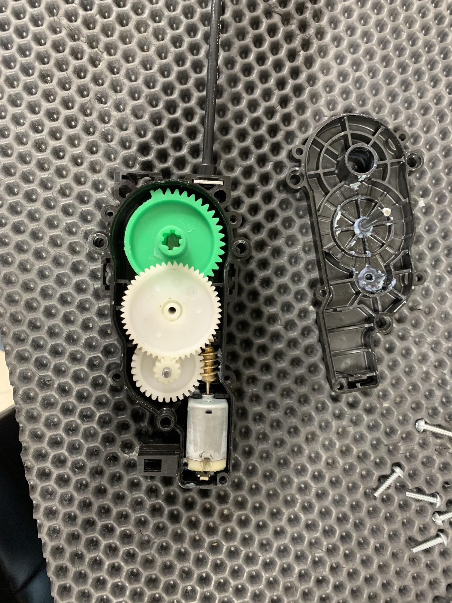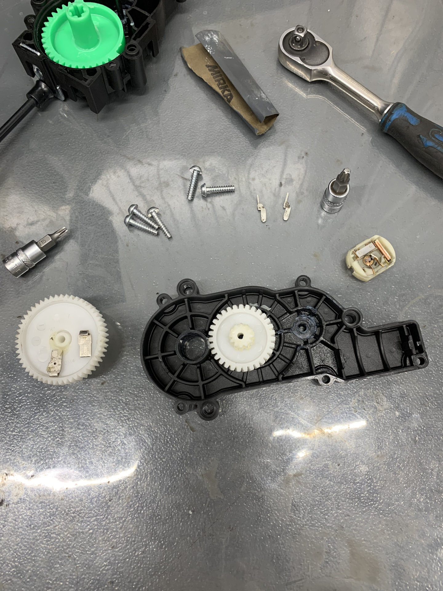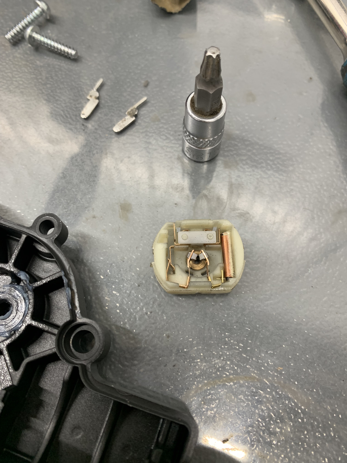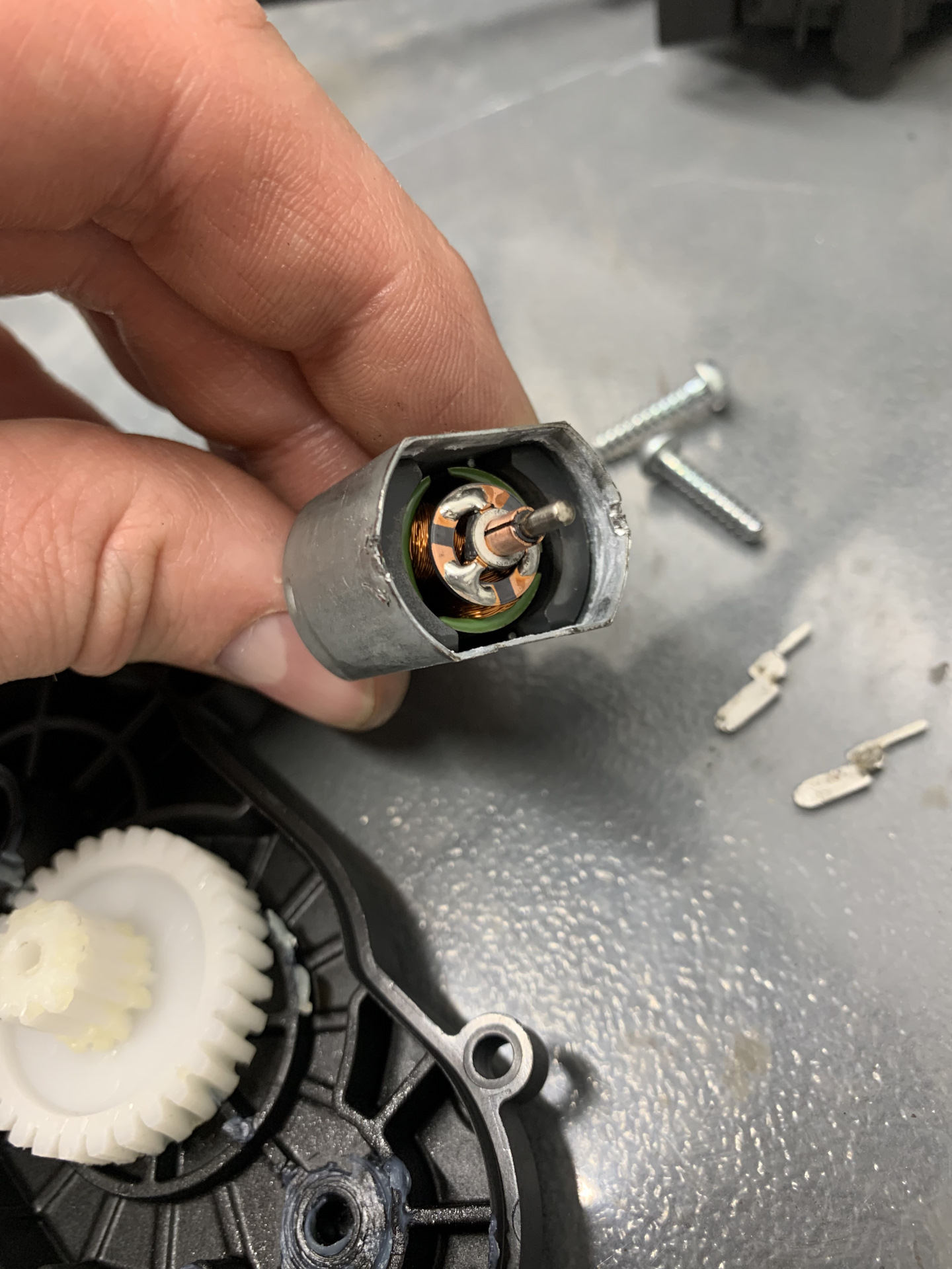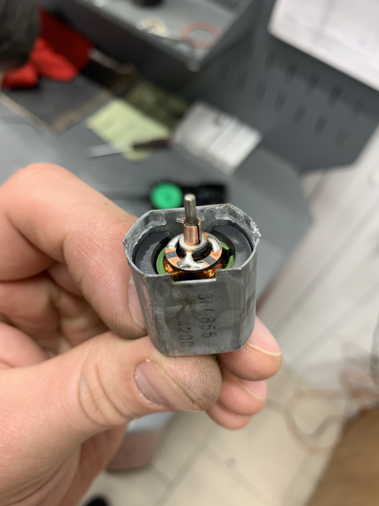 Разобрав привод столкнулись с тем что моторчик так легко от туда не вынимается, нагрели контакты и аккуратно их демонтировали из пластины, в моторчик они заходят свободно и держится только на контактах. В моём случае пропаяли на роторе и на щёточном узлу контакты и все заработало, и так же моторчик был весь в белом налёте.