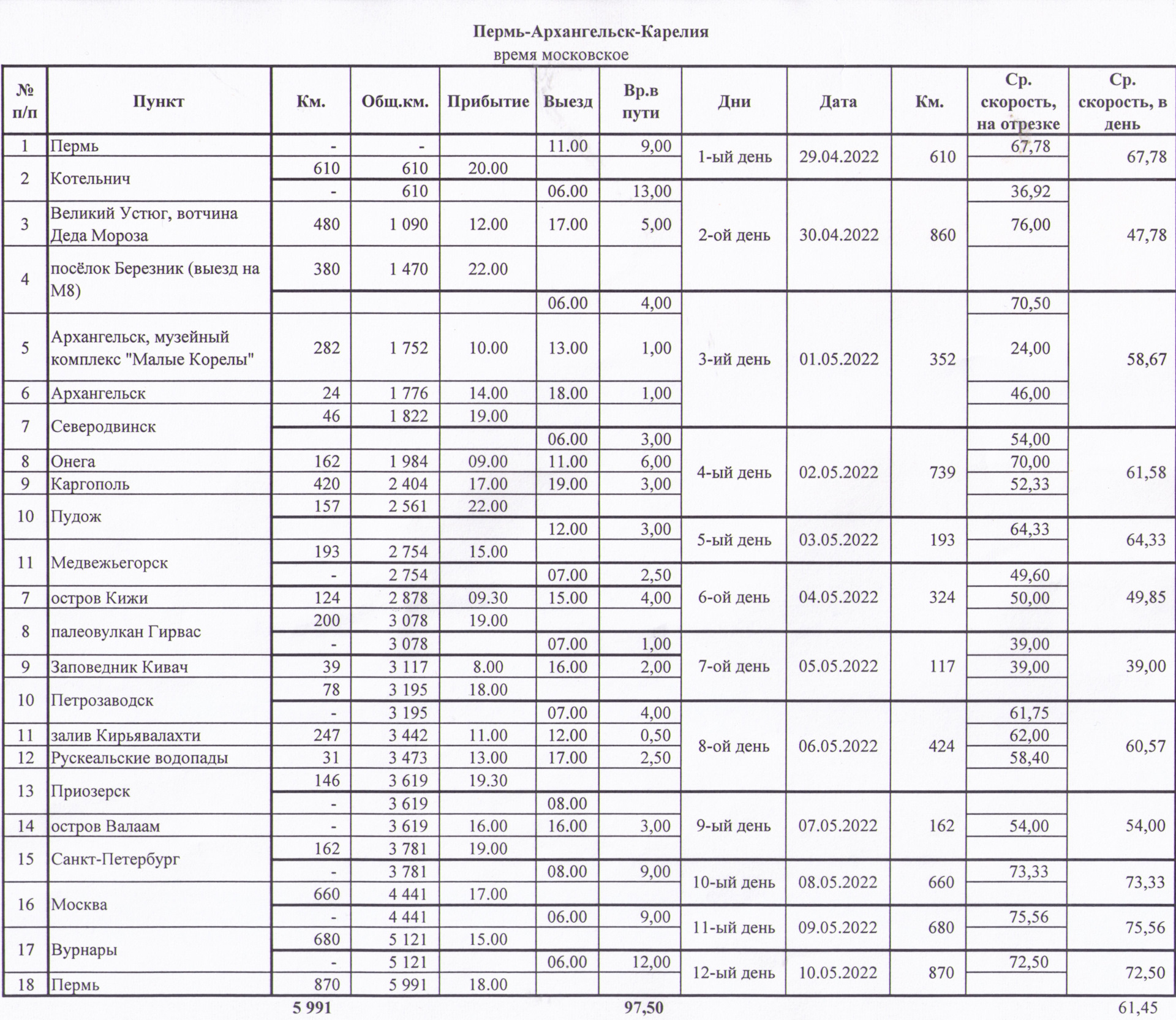 Для ориентира сделал подробный маршрут: Пермь — Киров (объездная) — Котельнич — Шарья — Никольск — Великий Устюг — Котлас — Березник — Архангельск — Северодвинск — Онега — Плесецк — Каргополь — Пудож — Медвежьегорск — Петрозаводск — остров Кижи (если будет доступна навигация) — Сортавала — остров Валаам (если будет доступна навигация) — Санкт-Петербург — Москва — Вурнары — Пермь.