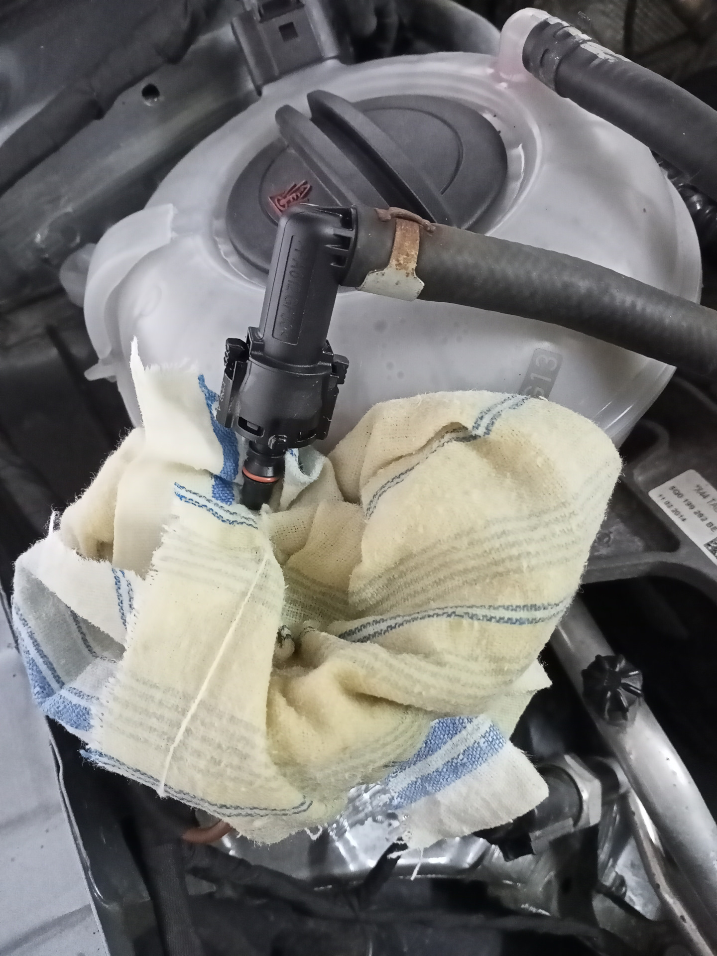 ВАЖНО ! на моторах TSI — не допустить момента, когда жидкость полностью закончится, и двигатель хапнет воздуха. Поэтому — если моете вдвоём, то 1 газует а второй следит за уровнем в системе. Если в одиночку — то газуете а рука на ключе зажигания, почувствовали что обороты упали, двигатель по другому начал работать — глушим. Или периодически проверяем уровень . По конкретной ситуации. Желательно что бы двигатель не заглох сам. На MPI — там ничего страшного )