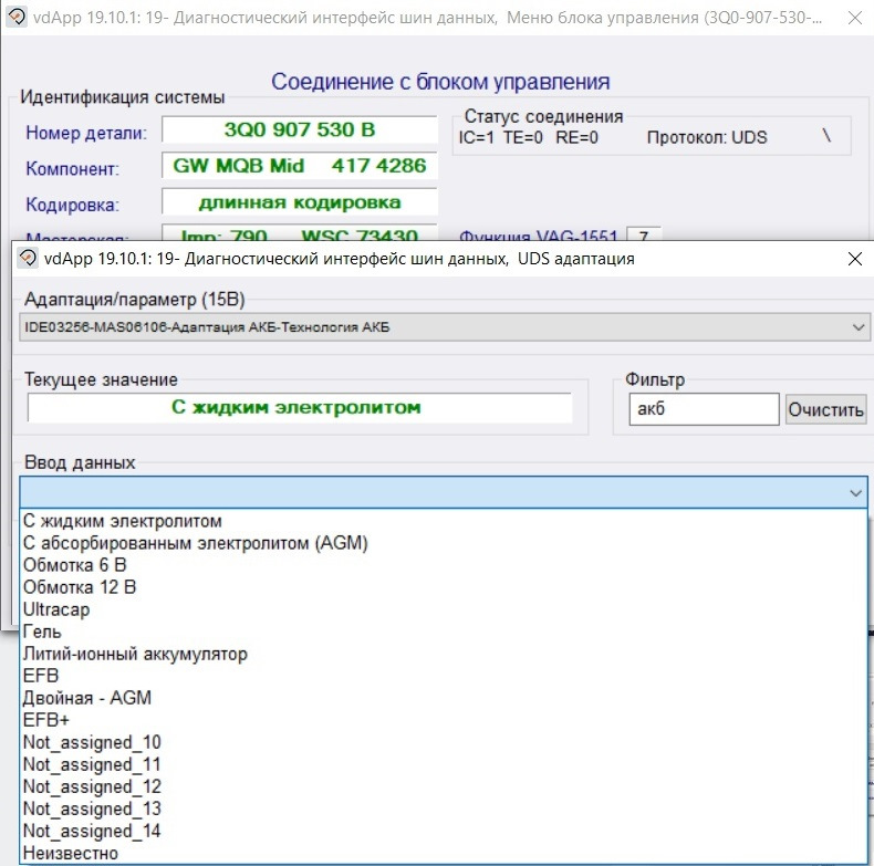 Далее Васей потер все ошибки, связанные с пониженным напряжением и прописал измененную емкость. Заходим в 19 блок, выбираем фильтр "акб"