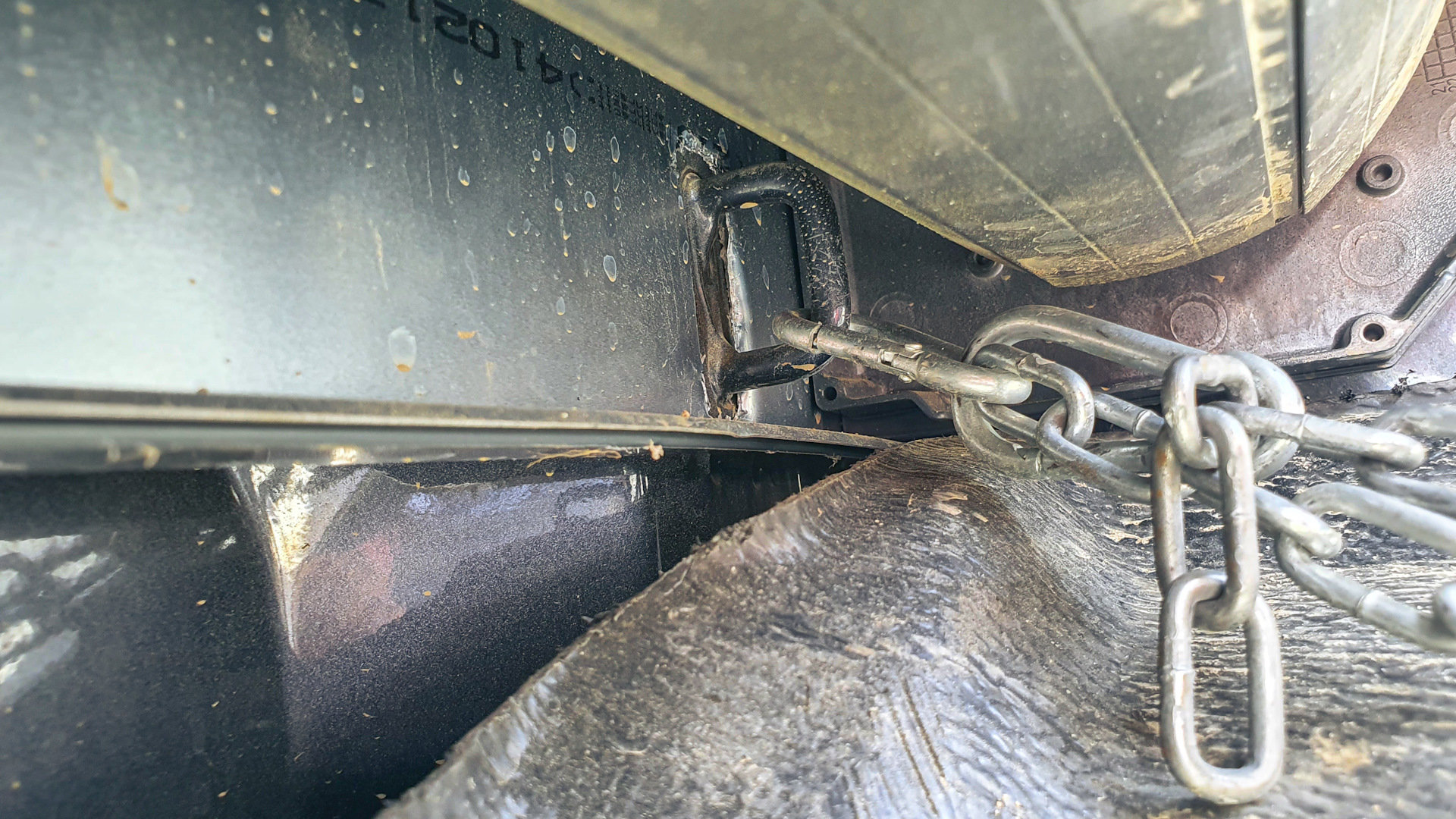 За заднюю проушину крепится цепь, которая держит лопату. Так она не болтается и прочно висит сбоку, не мешая.