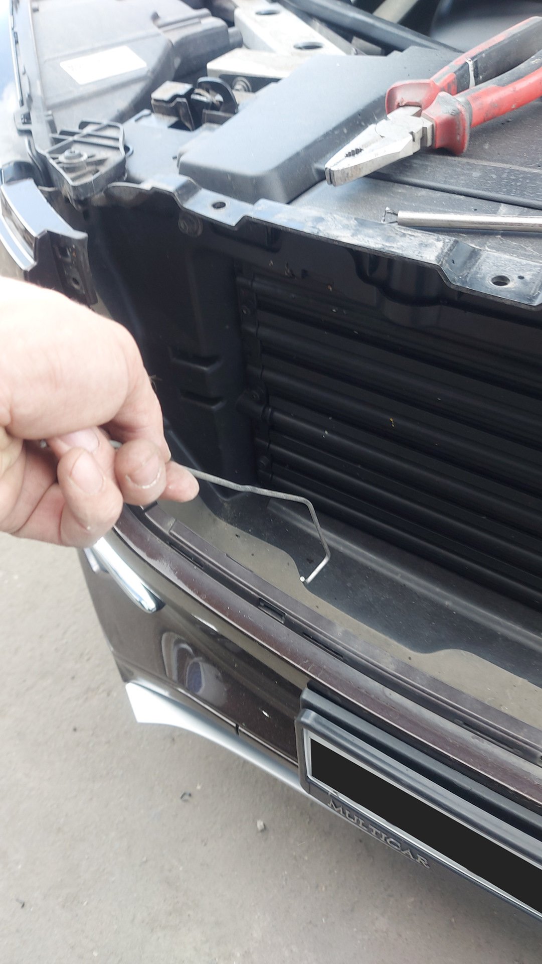 Лайфхак 2))) Согнул из обычного электрода(для сварки) крючок(как раз его упомянал выше) и через щели в решетке- благополучно и без каких либо сложностей, отщелкнул все нижние защелки.