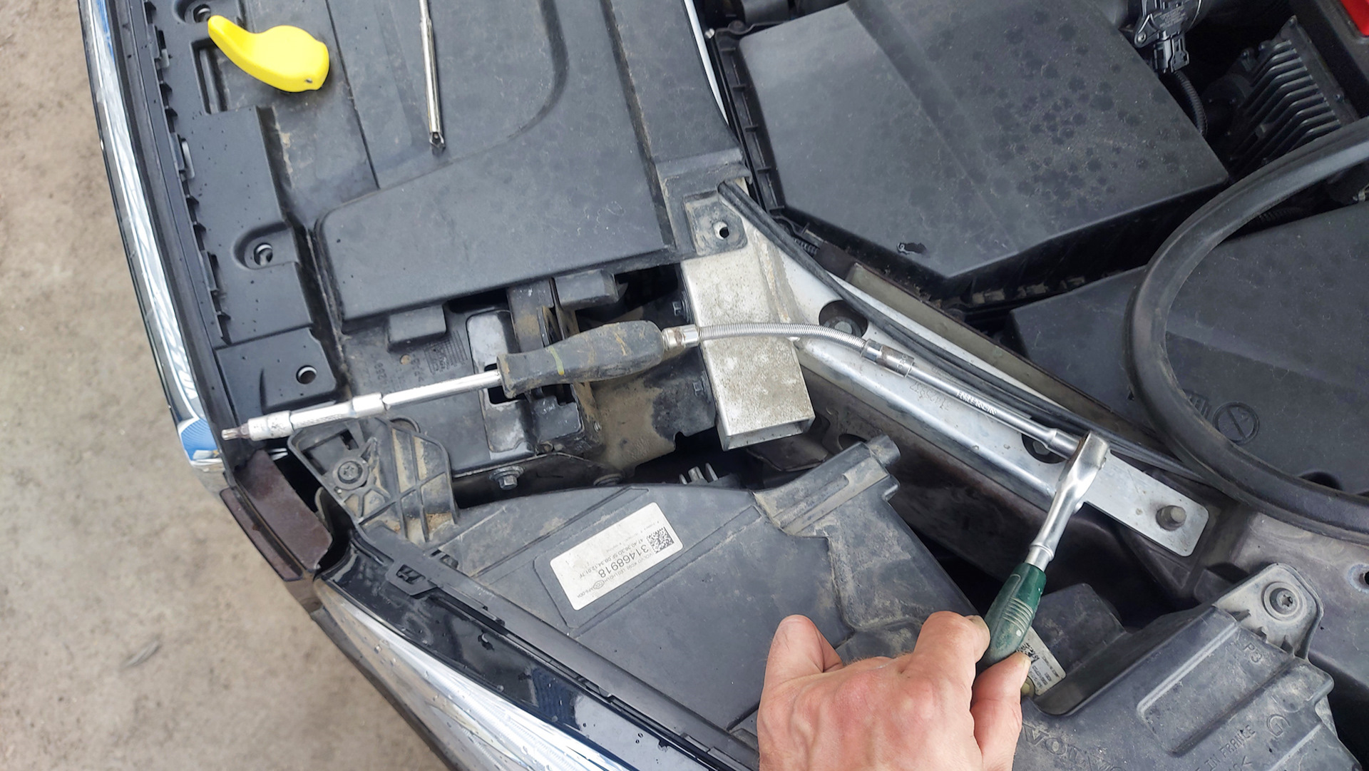 На фото как раз собранная комбинация для откручивания и находится она прямо над так называемым туннельчиком, через который все это деяние совершается. Единственное дополнение( удобнее попадать торексом в шляпку самореза, если сделать обычный крючок(о нем расскажу ниже) и через отверстие замка капота направить.