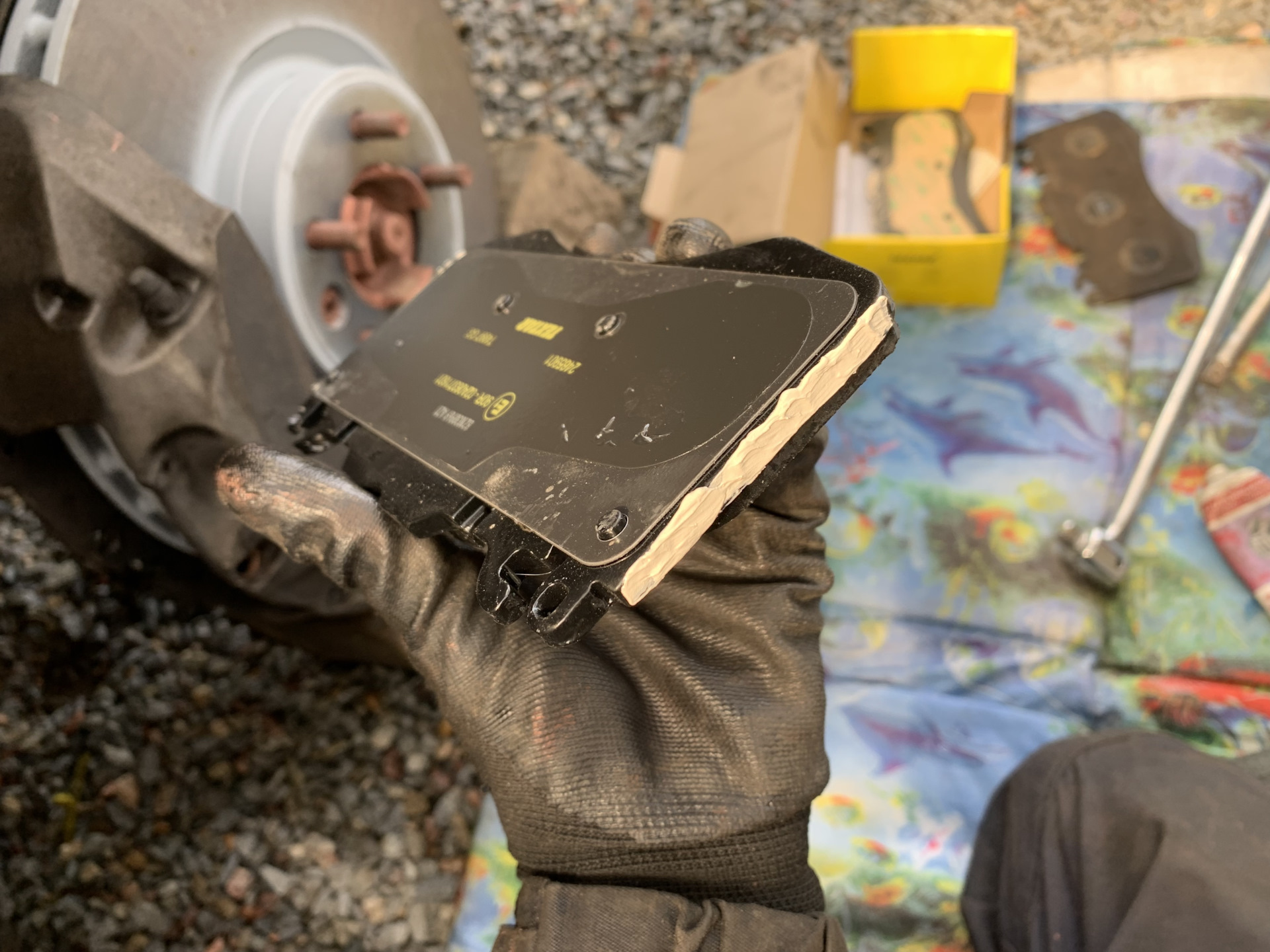 На колодках снимаем защитную бумагу с клеевого слоя.