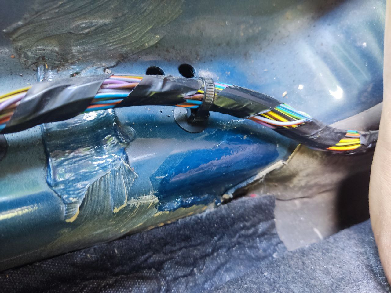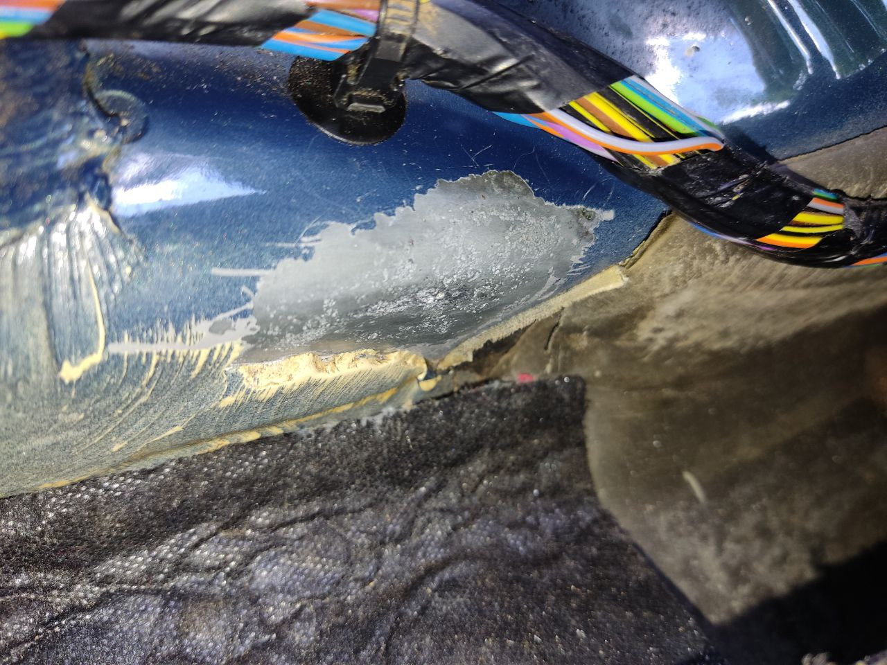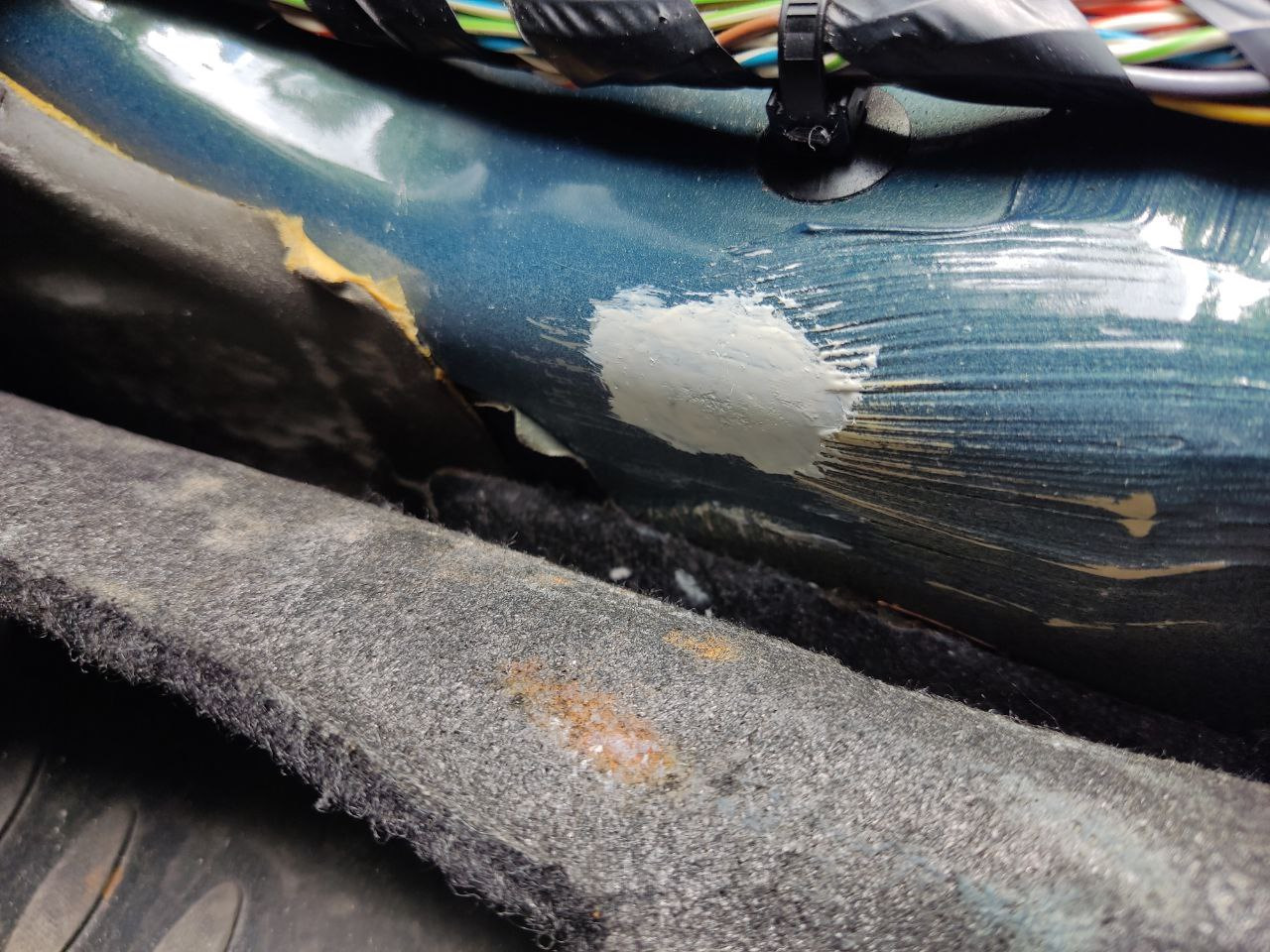 Когда устанавливал задние динамики, обнаружил, что ковёр протёр краску под пластиковыми порогами водителя и пассажира и даже успели образоваться кратеры. Странно. Ни у кого больше такого не видел.