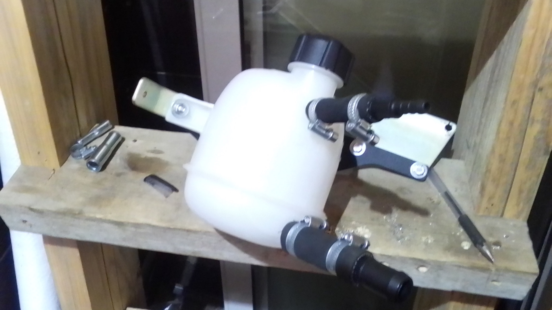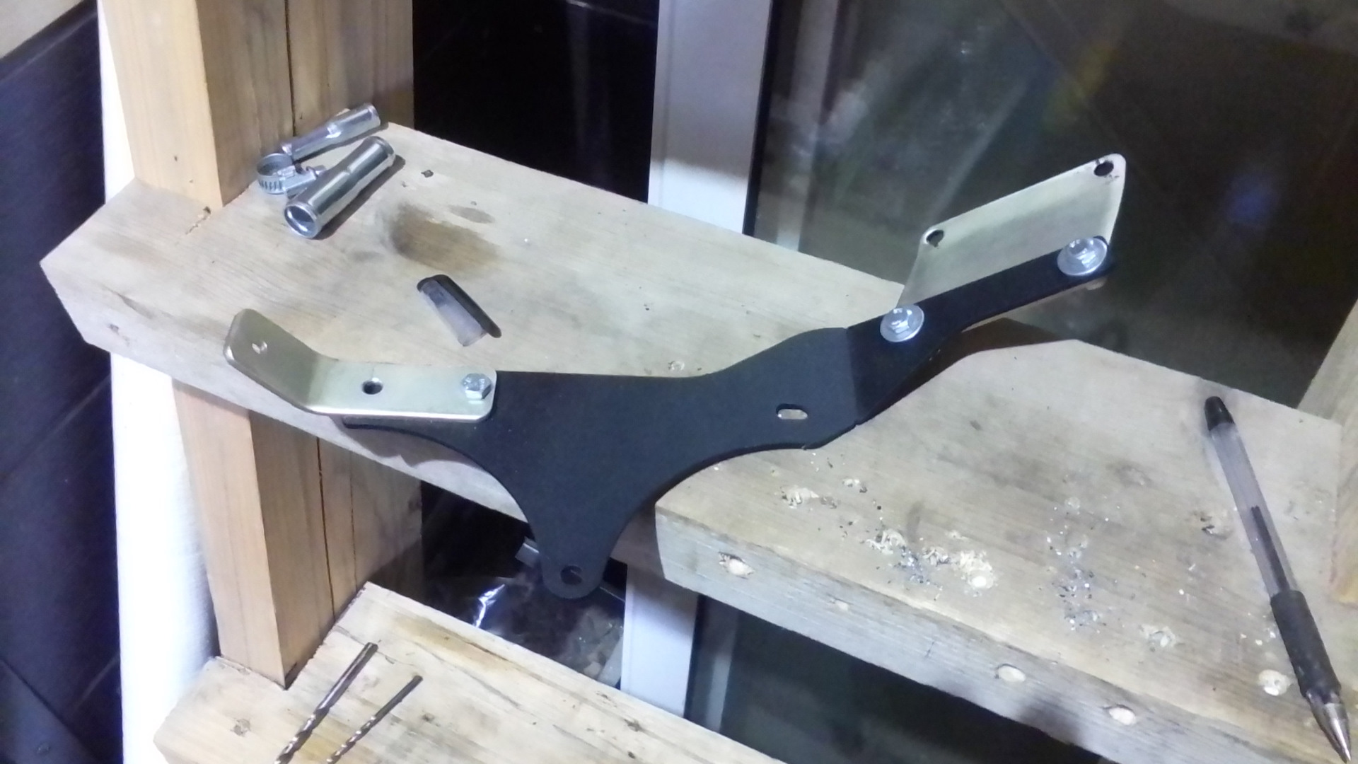 Более крупная деталь — это переход от шпилек крепления абсорбера к кронштейну бачка от Ларгуса. Более мелкая — просто уголок крепления (я посчитал, что не стоит бачку консольно висеть на таком плече), пусть будет три точки крепления.
