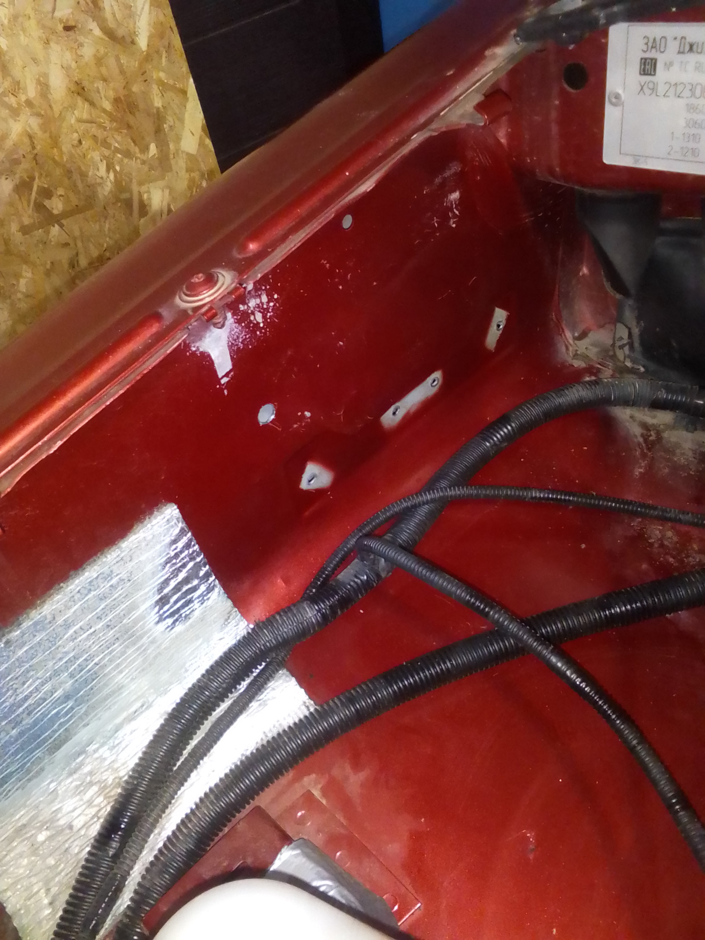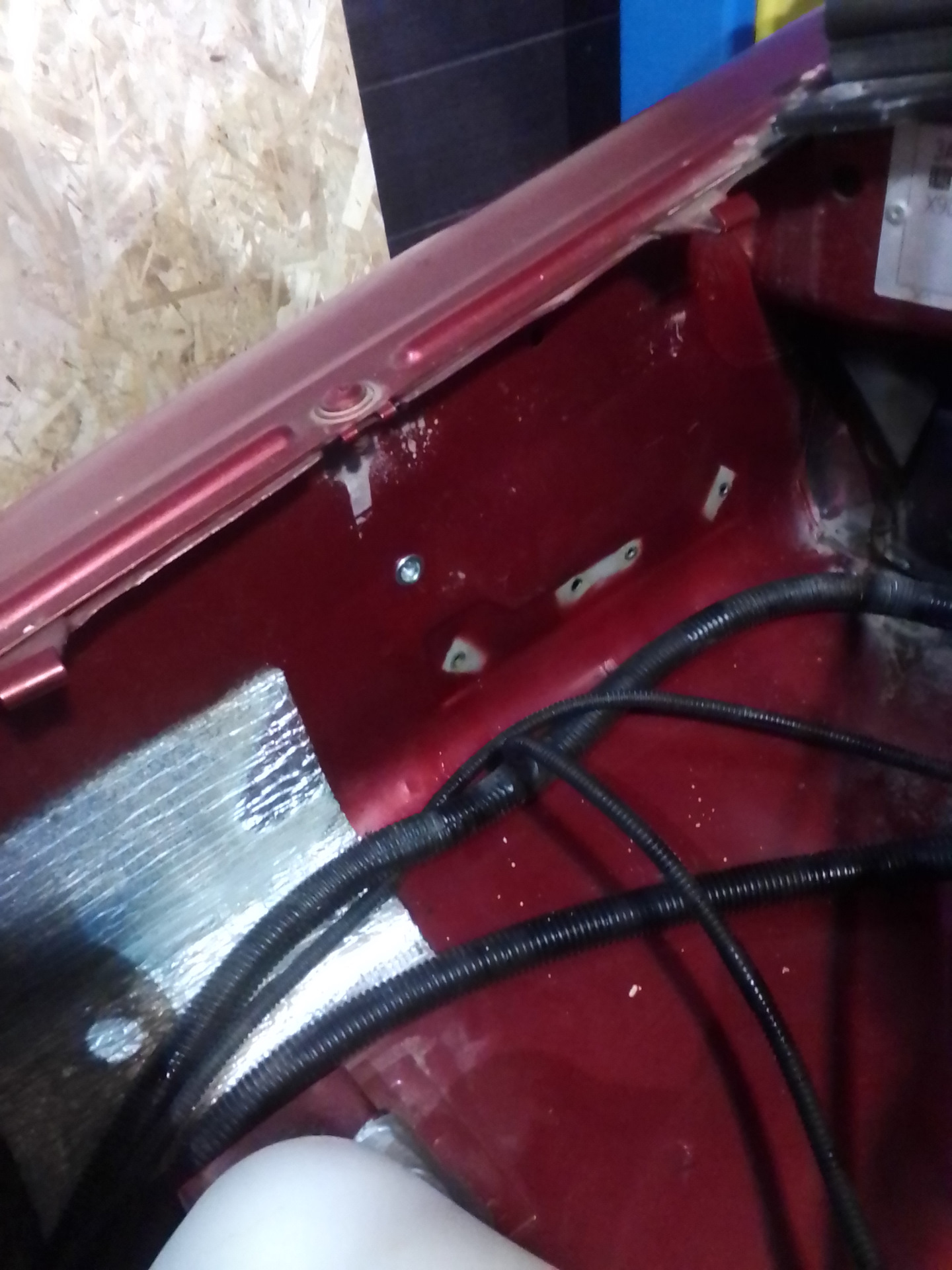 Очищаю и обезжириваю то место, куда была наклеена пенка под штатный бачок. Приклеиваю вибропласт из старых запасов. Он прекрасно закроет как потертости, так и отверстия от заклепок крепления кронштейна штатного бачка.