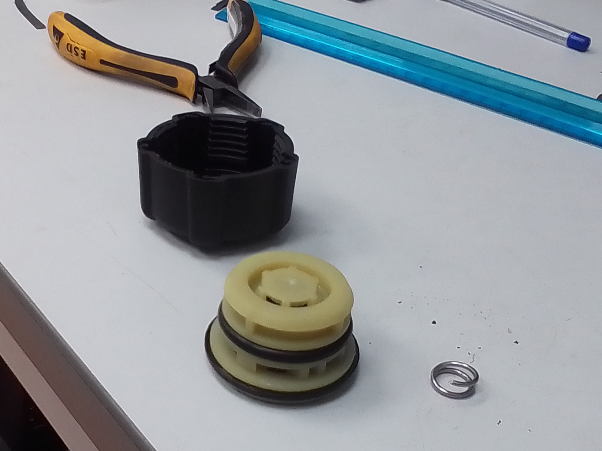 Потом все очевидно. На обратной стороне клапана пробки (она в кадр не попала), поддеваю плоской отверкой черную крышку, она же упор пружины. Откусываю от пружины виток (он в кадр попал, можете оценить, сколько надо кусать) и собираю все обратно. На этапе подбора стопорное кольцо лучше снять. Его наличие или отсутствие на функционал и герметичность крышки не влияет, зато если не «попали в давление», то не надо повторять разборку.