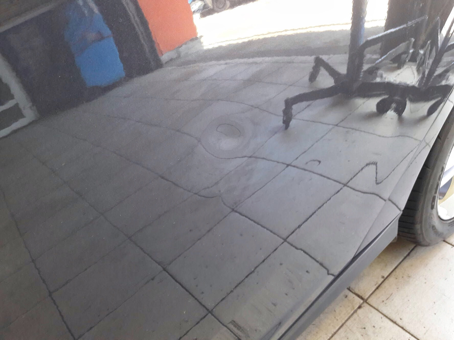 До определенного момента в сервисе все шло очень гладко, чинно и благородно с развеселыми беседами, перекурами и кофетаймами. Но в конце, случилось то, о чем никто из присутствующих даже подумать не мог. При финальном спуске с подъемника, старикан получил приличный удар упавшей на него телескопической стойкой. И как вы думаете куда? Правильно, по свежеоткрашенным задней двери и заднему крылу.