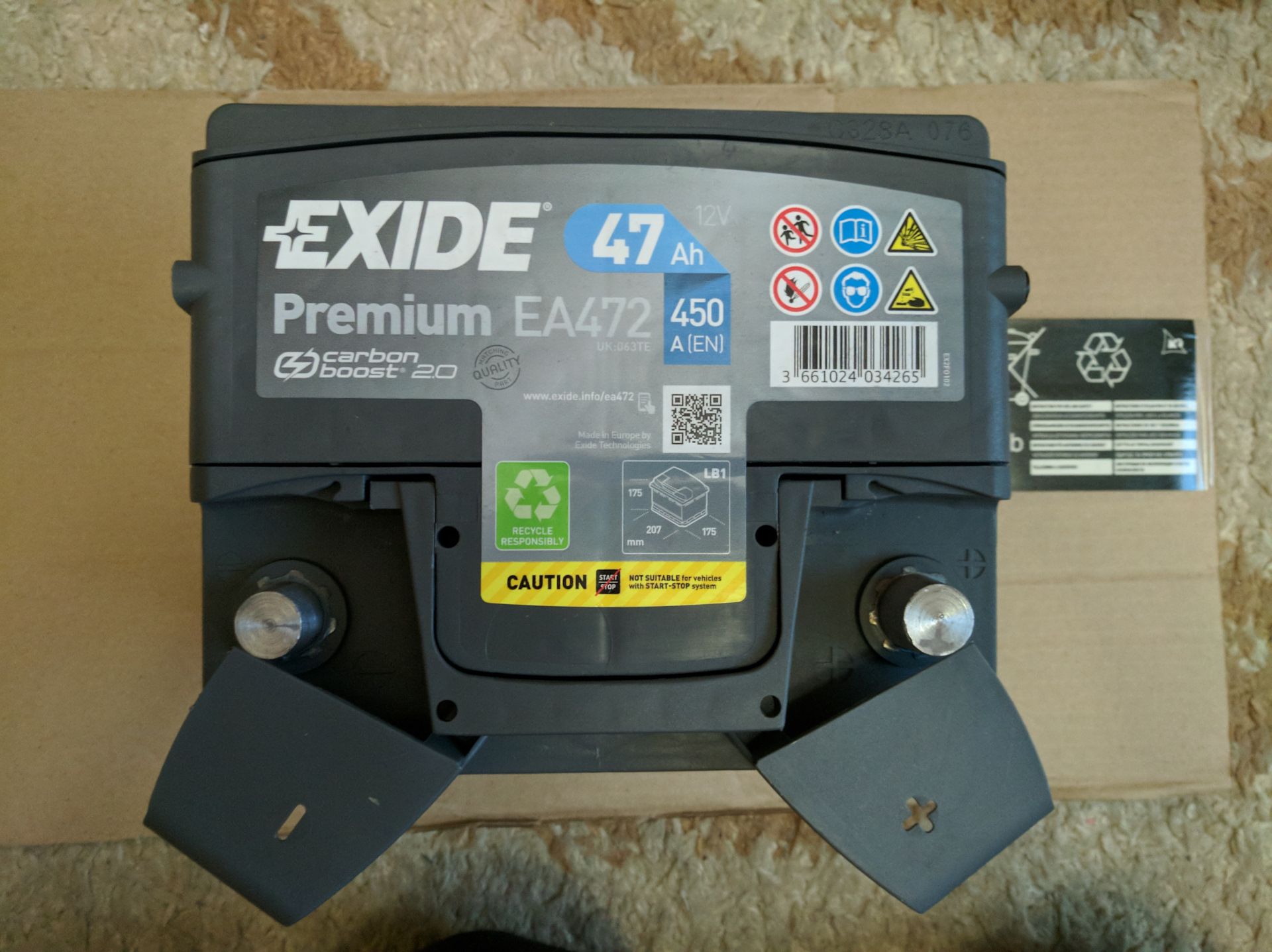 И тут мне попался аккумулятор-Exide Premium 47Ah 450A,артикул EA472. Производится в Европе. По заявлению производителя заряжается в 2 раза быстрее по сравнению с другими аккумуляторами, дополнительные 30% пусковой мощности, идеально подходит для городских условий.На нем я и остановился.Приобрел у официалов.Проверили вилкой, все хорошо.Гарантия-год.Дата производства-август 2020, т.е. свежий.