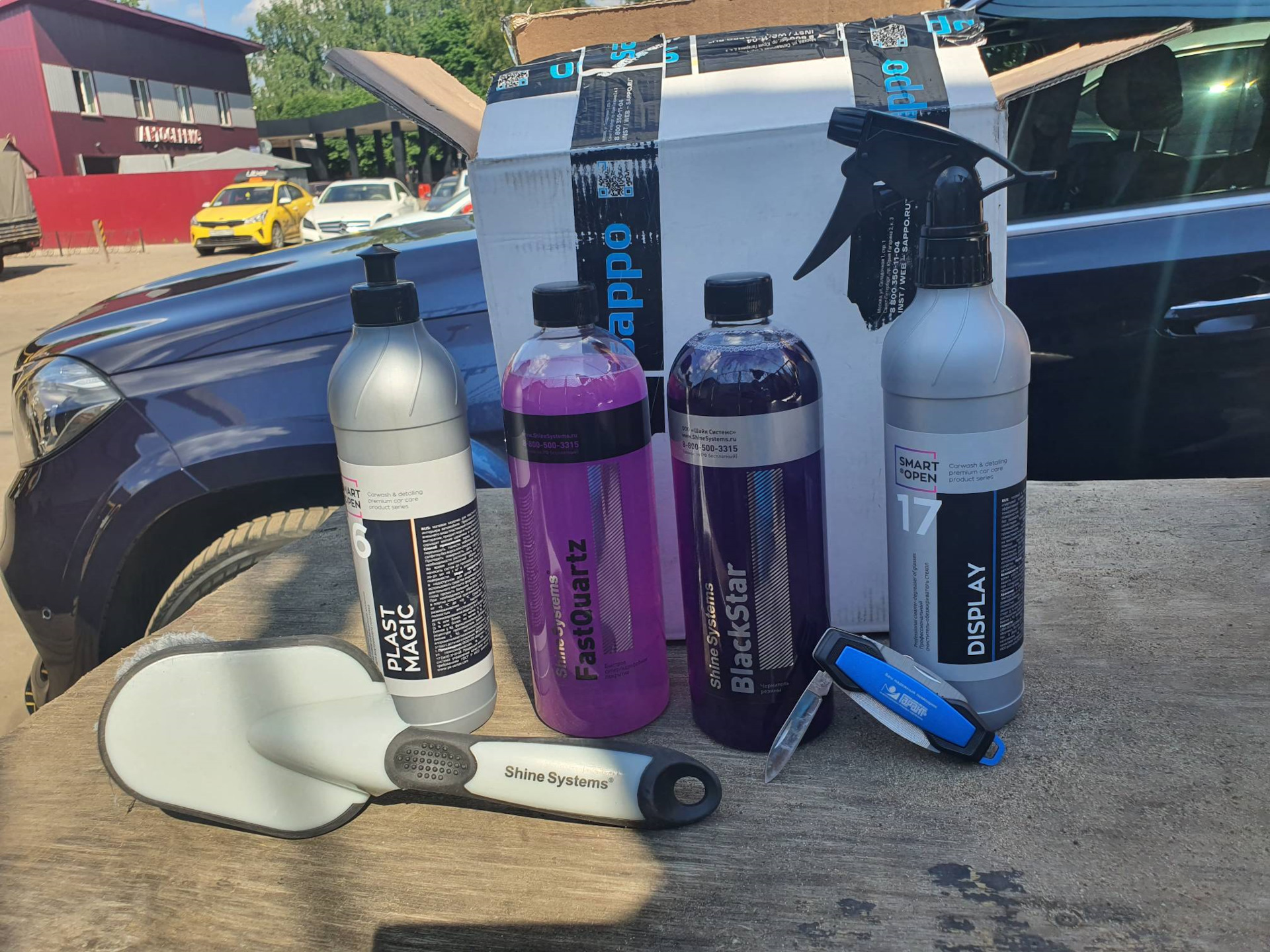 Аккуратно (варварски) вскрыв упаковку я обнаружил любопытный набор "химозы" для ухода за автомобилем, беглый осмотр показал присутствие двух производителей Smart Open и Shine Systems. Как потом сказал Алексей, производство у них находится в РФ, поэтому и цены довольно гуманные, но малая цена не всегда равно хорошее качество (об этом очень скоро расскажу отдельно, но там будет не про химию).