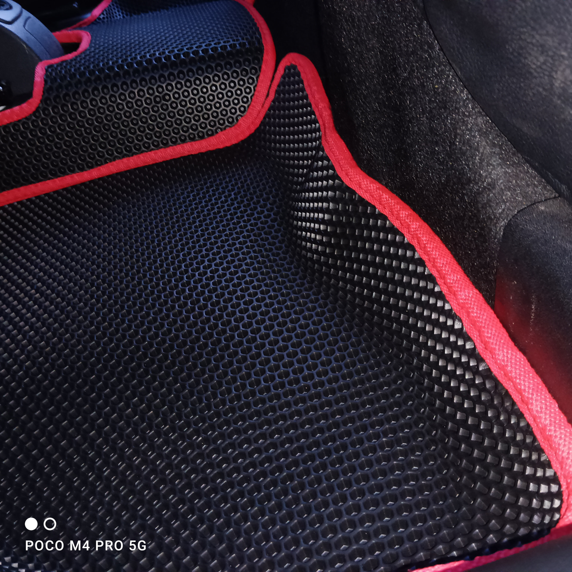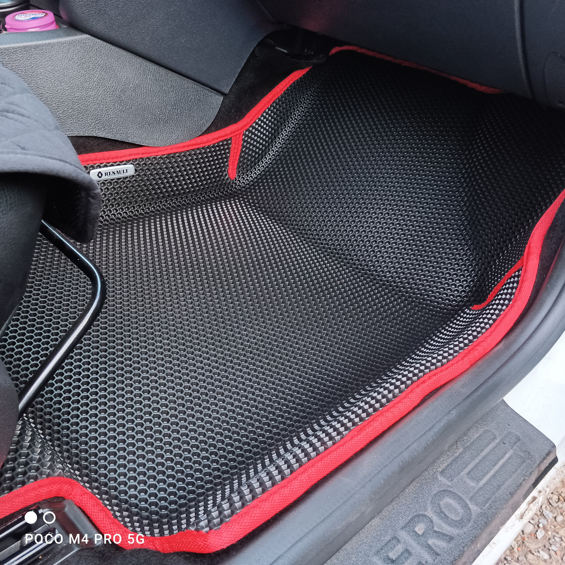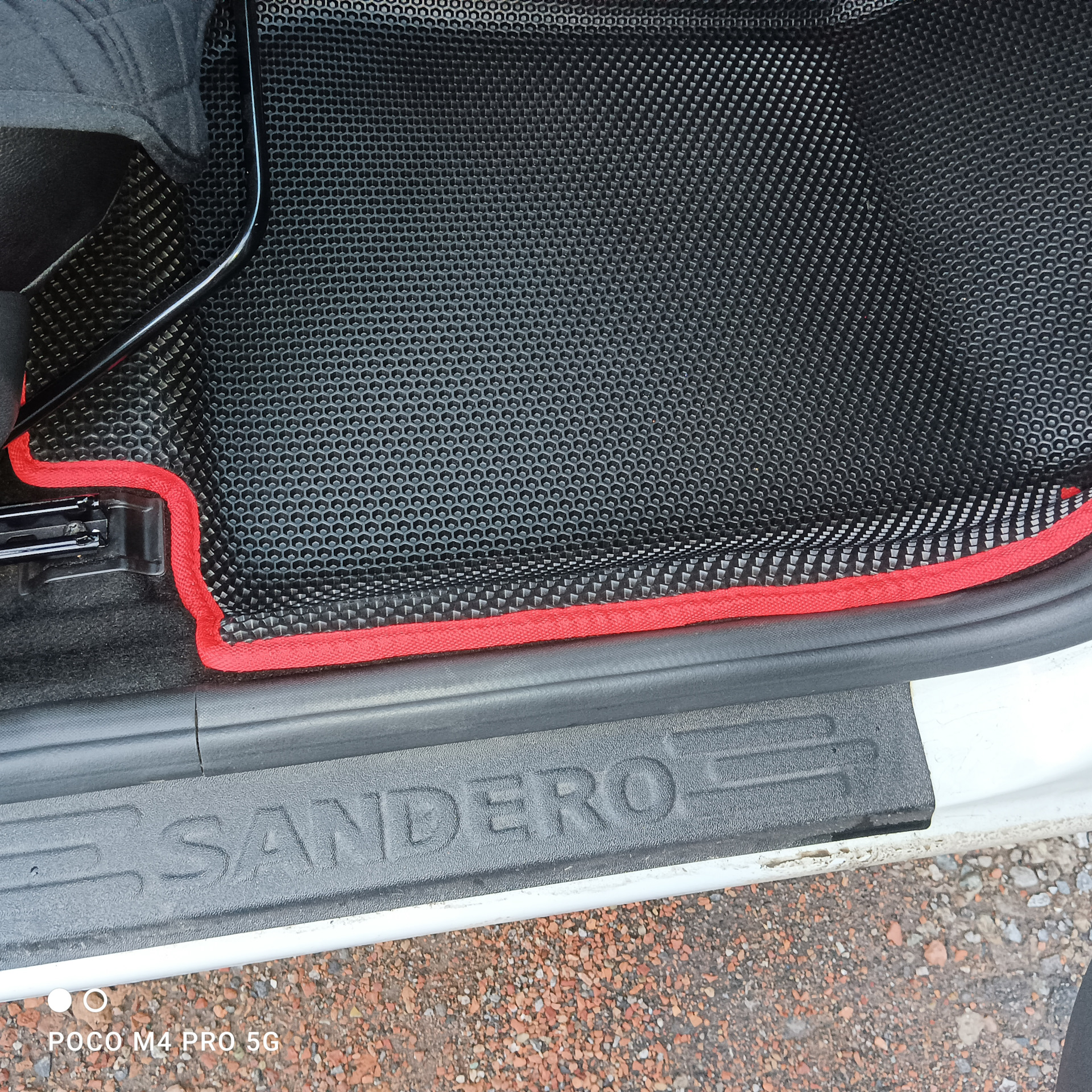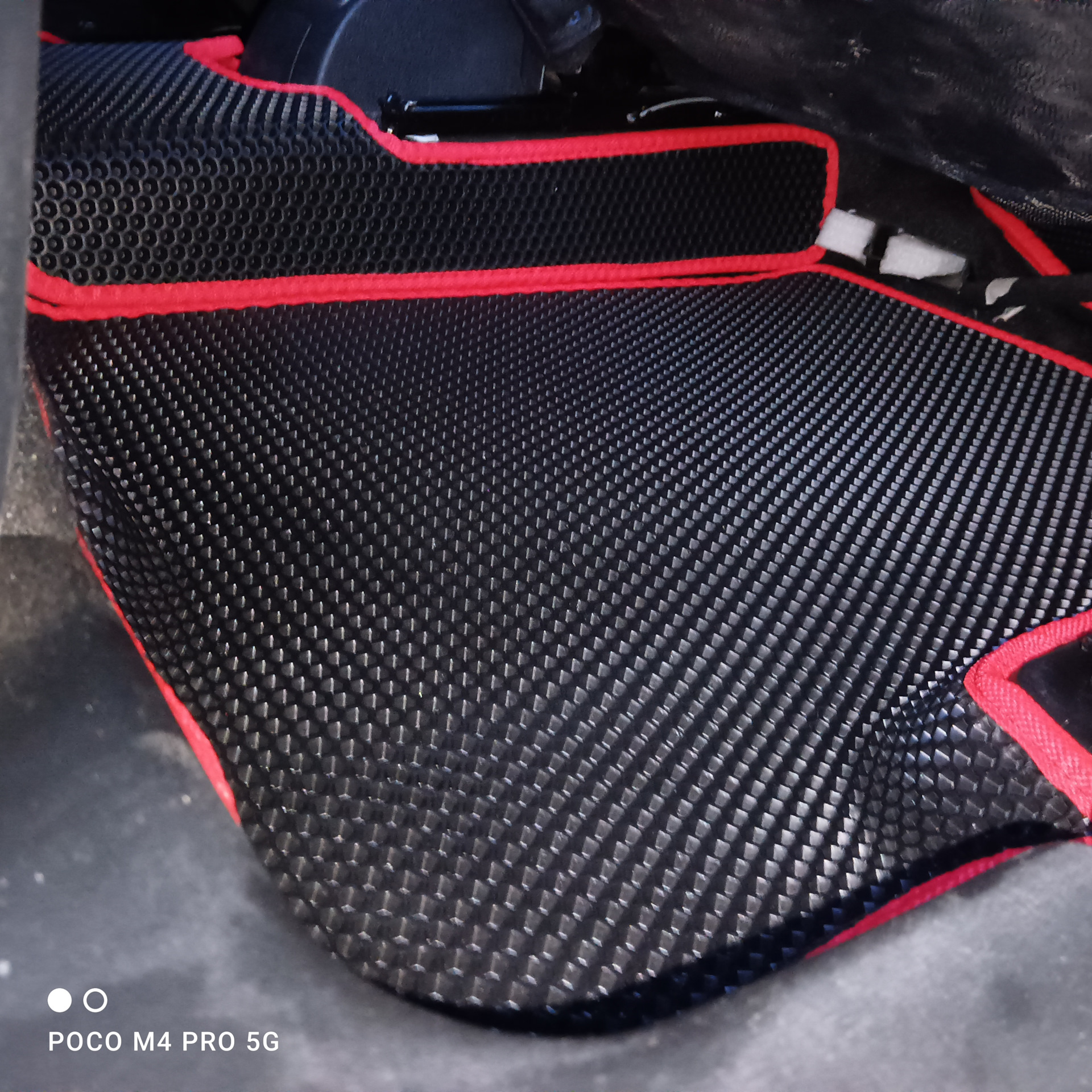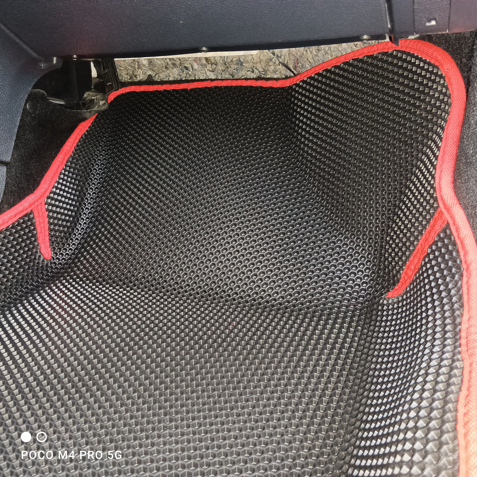 Пассажирский коврик, перед: наконец то, свершилось великое — закрыт с правой сторный верхний уголок, у меня жена туда ноги постоянно ставит, соответственно грязь, пыль, тут закрыто — красота; высокие борта; заход под сиденье, логотип.