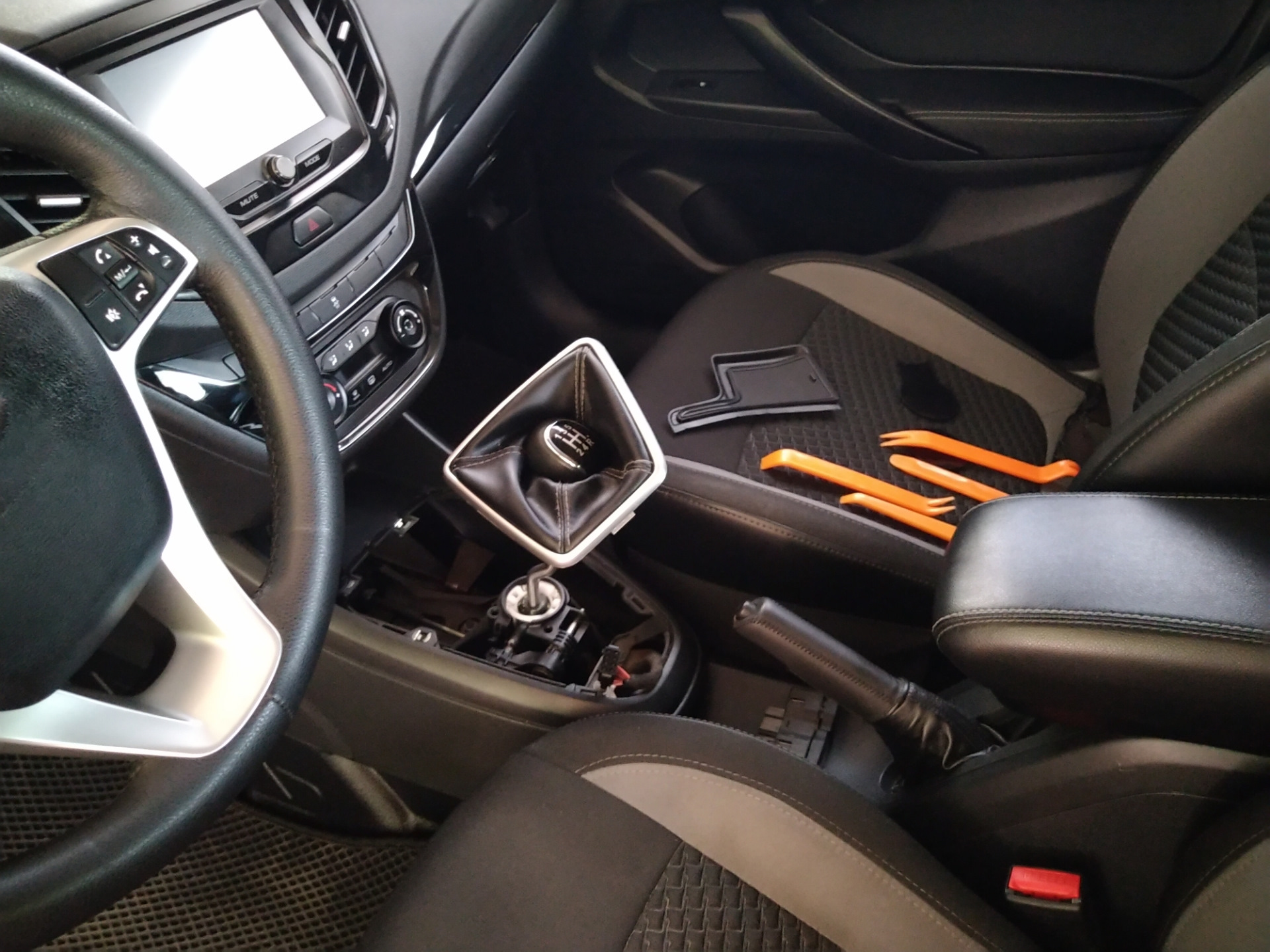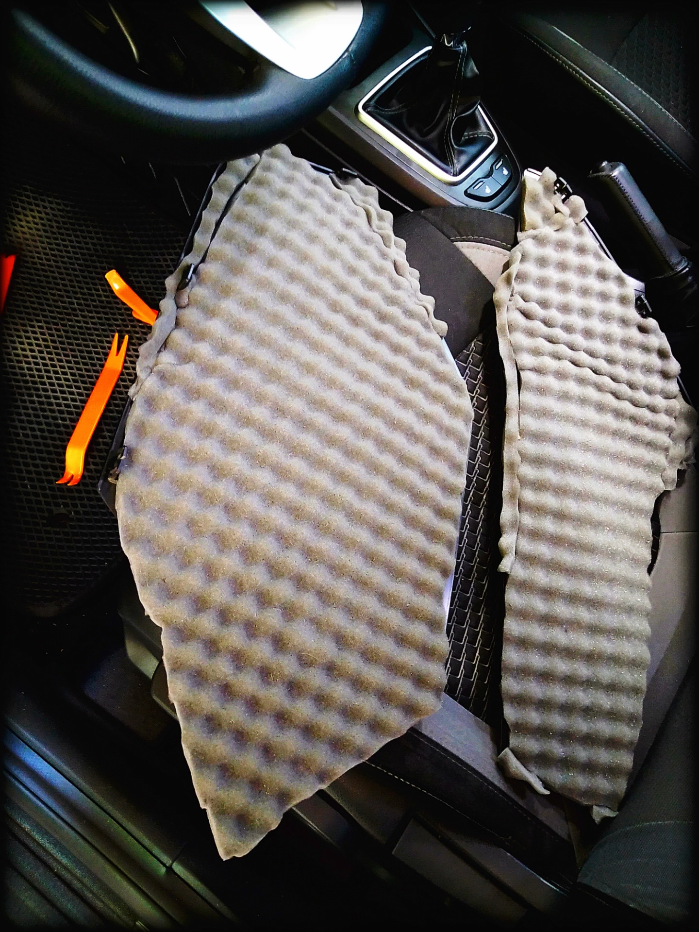 Ну один кусок вырезал с запасом и засунул впритык, а второй наклеил на панель подстаканников и накрыл сверху, ну и по бокам накладки зашумел заодно 😏