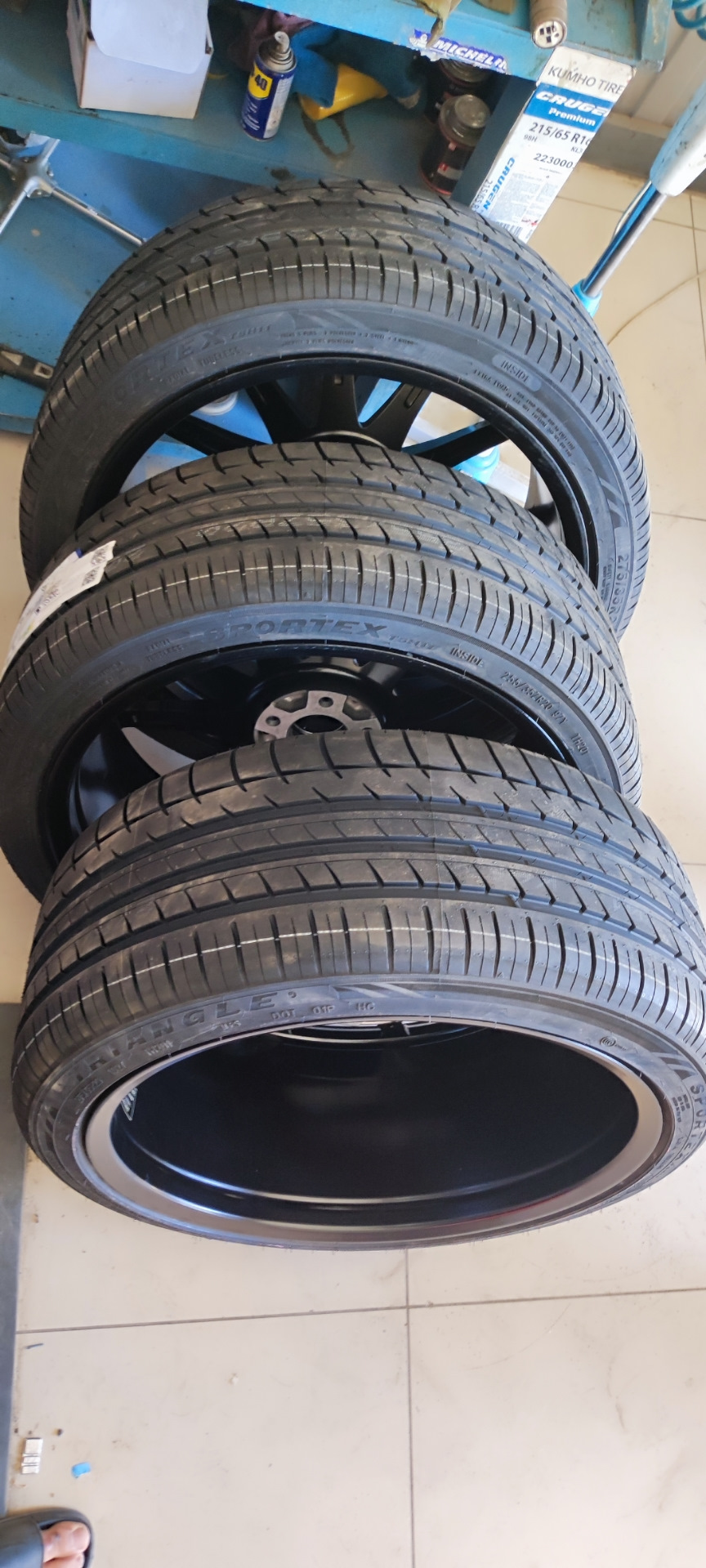 Вчера получил сообщение от ПЭК, резина готова к выдаче. Отлично. Выходные, без проблем поехал, забрал. Договорился о шиномонтаже, привёз диски и резину, все собрали и долгожданная примерка. Результатом очень доволен, новые диски, новая резина Triangle TH201 sportex .