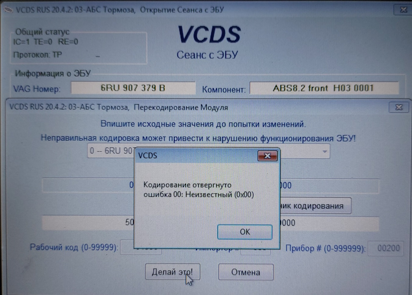 Блок 6RU907379B, кодировка 500200C2007100B50A2A00E300D700000000 оригинальная, но не принимается и появляется ошибка "Кодирование отвергнуто ошибка 00: Неизвестный (0x00)":