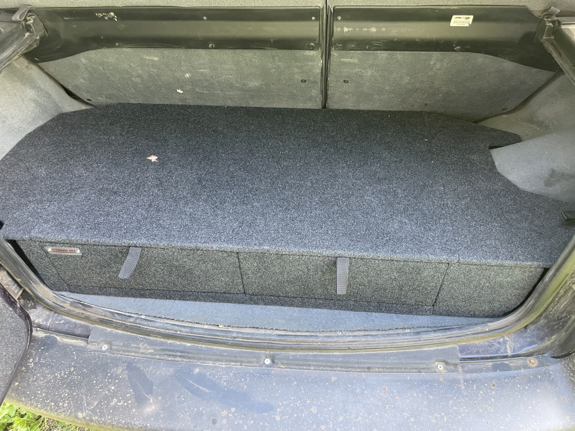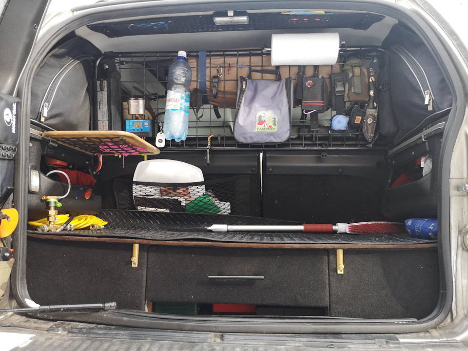 Была, когда то идея, что то подобное сделать. Но жизнь показала-хорошо что не сделал)). Гораздо важнее (для моих нужд) иметь большой, практически ровный объем при сложенном заднем ряде сидений или полностью снятом. Вся мелочевка в боковых карманах, на "липучках", которые можно за три секунды снять и забросить хоть пассажиру в ноги. И спальное место можно организовать быстро, при необходимости и практически ровно.Для тех, кто выезжает из города только на пляж, возможно и нормальный вариант. Карпет в багажнике, так себе решение, не практично, пылесборник еще тот. Это мое личное мнение.