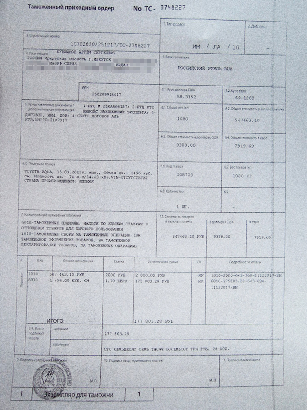 Только не понял, почему в таможенном ордере Тойота Аква.