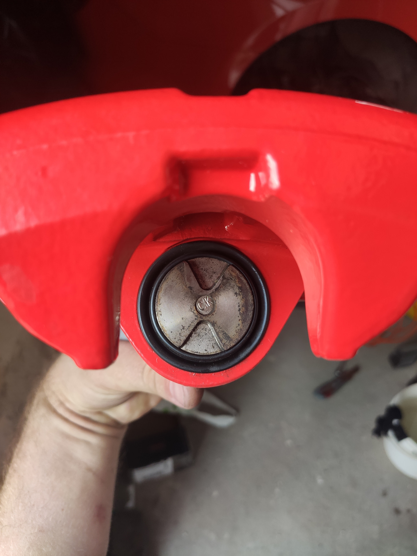 На этом фото видно, что суппорт примыкал к колодке с индикатором износа, а она изношена меньше (видно по фото выше), соответственно выше я предложил колодку с индикатором износа установить на наружную часть ротора.
