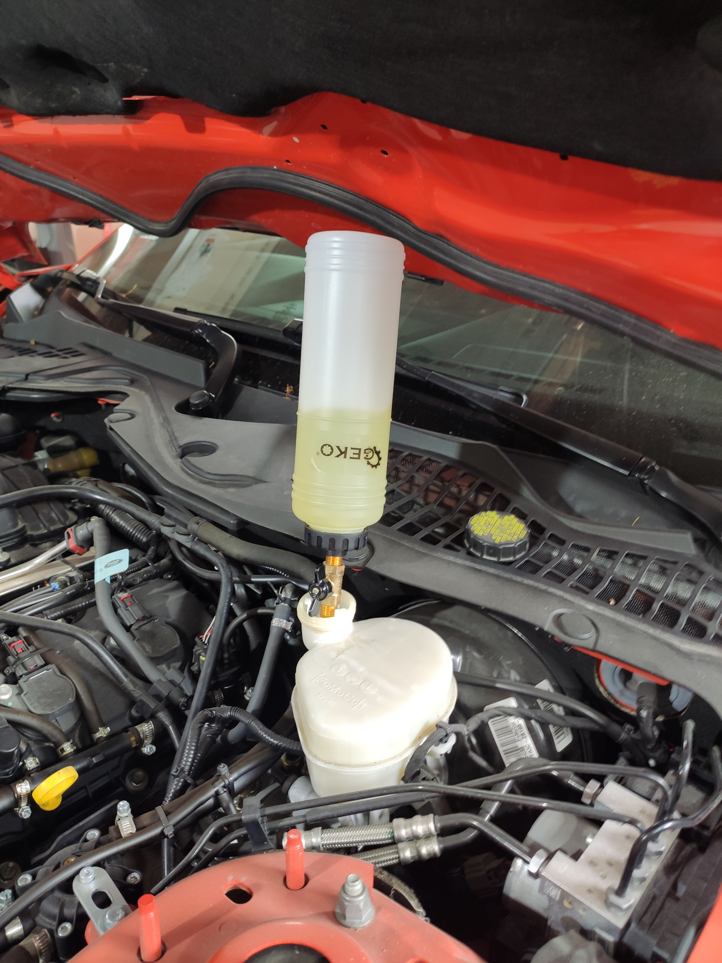 • Прокачиваем тормоза (начинаем с дальнего контура и идём к ближнему. Т. е. заднее правое колесо, заднее левое колесо, переднее правое и последним переднее левое колесо). Для прокачки было приобретено специальное устройство для прокачки колес. Смыл его работы заключается в выкачивании из корпуса суппорта тормозной жидкости. В резервный бачок наливаем тормозную жидкость DOT 4 LV, и устанавливаем на расширительный бачек.