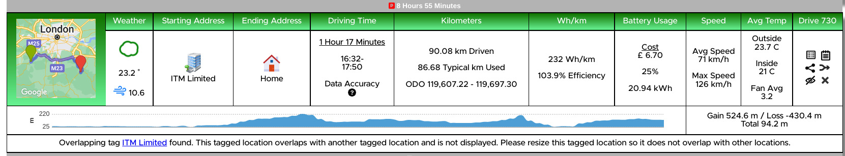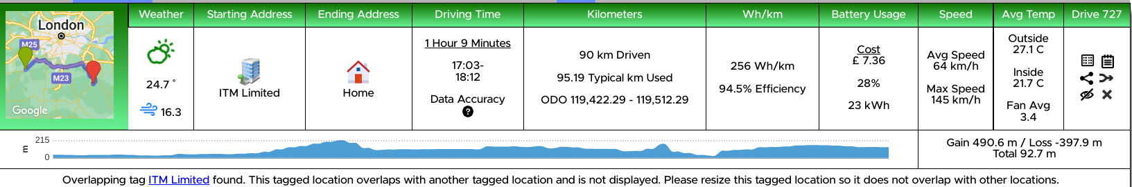 И вот сегодня я проделал полевое испытание и проехал одинаковый путь в обе стороны с приблизительно равными средними результатами. С одной лишь разницей. В одну сторону рекуперация была в режиме Стандарт, а обратно в режиме Низкая.