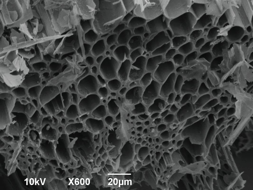 Точно также и молекулы загразняющих вечеств, содержащихся в воздухе должны застрять в порах угля. Вот фото активированного угля (сорбента) под микроскопом:
