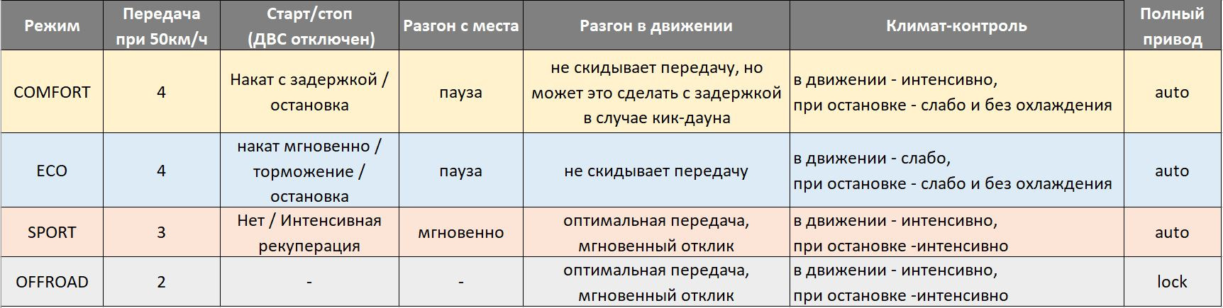 Решил поделиться наблюдениями по режимам движения. Поездил на всех режимах и понял, что разница есть. Основные различия кроются в выборе передач на одной и той же скорости (например 50км/ч), в работе системы старт/стоп, климат-контроля, в динамике разгона и в работе полного привода. Пока это просто наблюдения, которые не плохо бы подтвердить хотя бы записью видео панели приборов, а лучше данными со сканера OBD разъема, но к этому надо подготовиться на техническом уровне. А пока просто наблюдения. Если никому не интересны мои эмоции/рассуждения то предлагаю сразу ознакомиться с шортлистом сведенным в таблицу и не читать дальше.