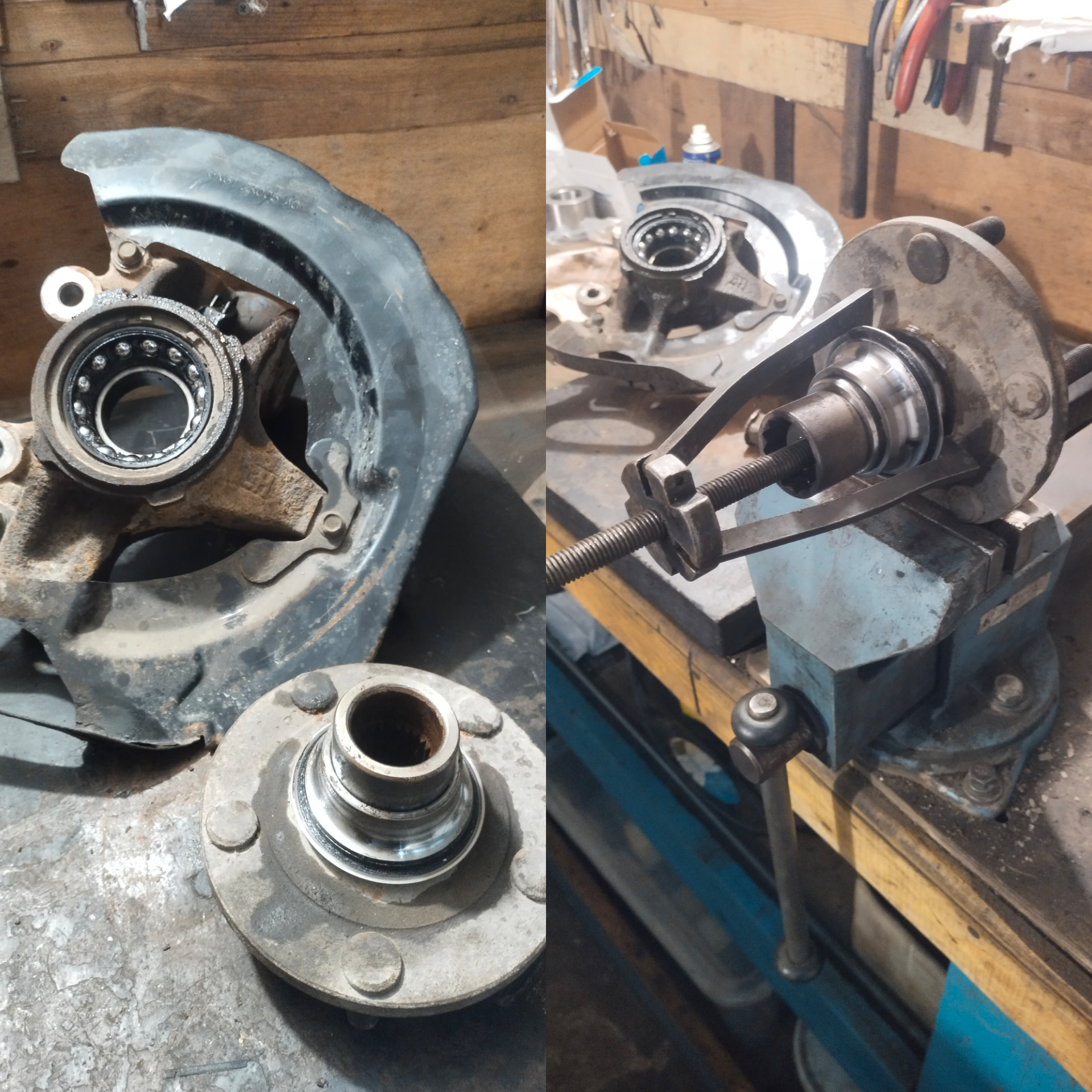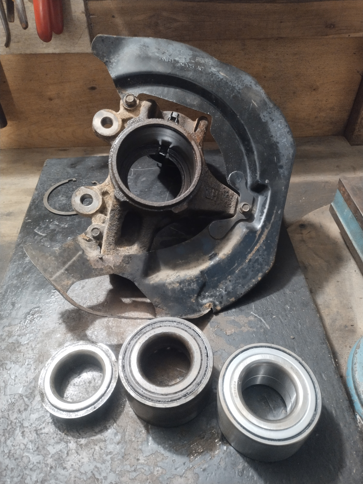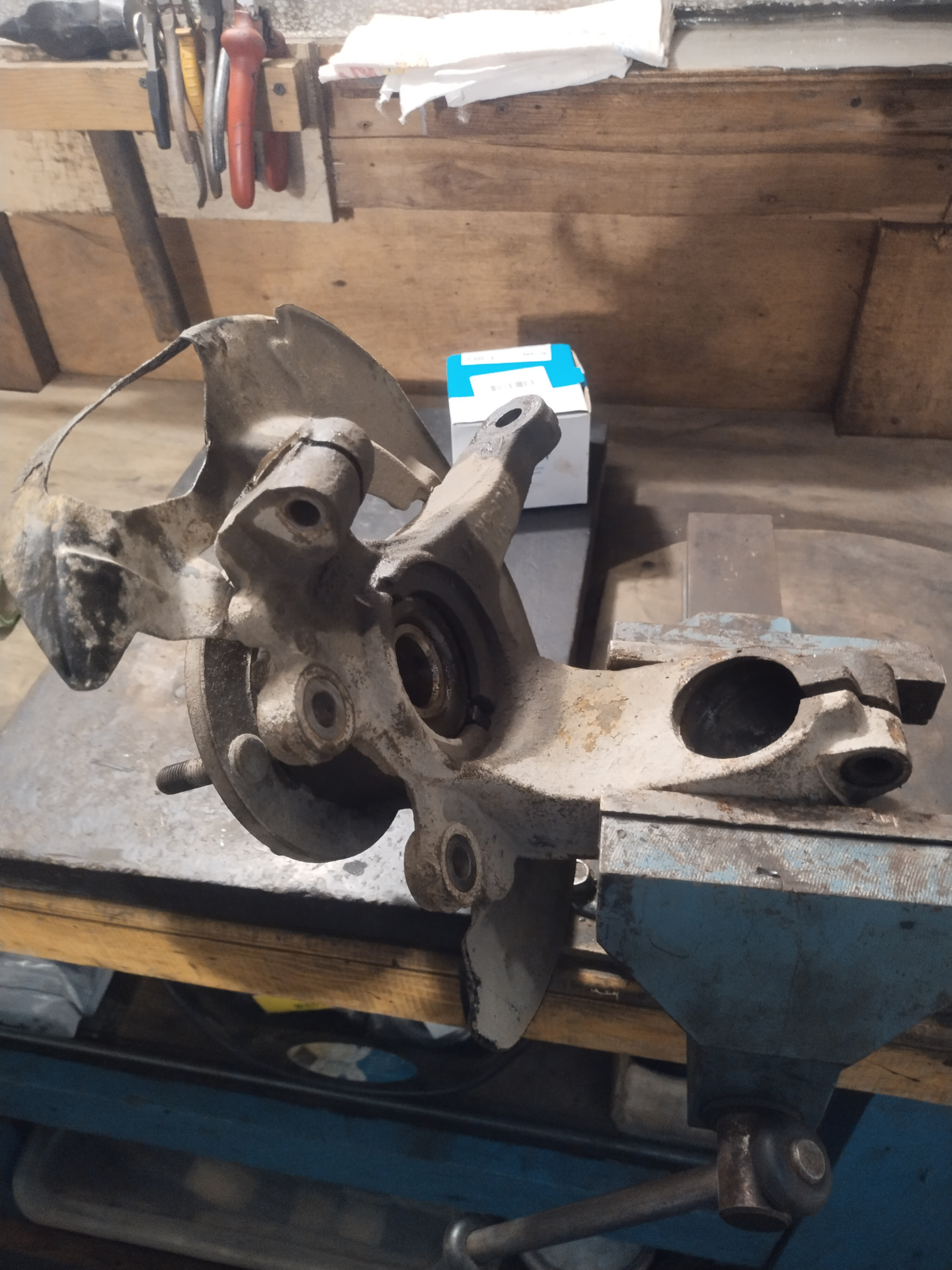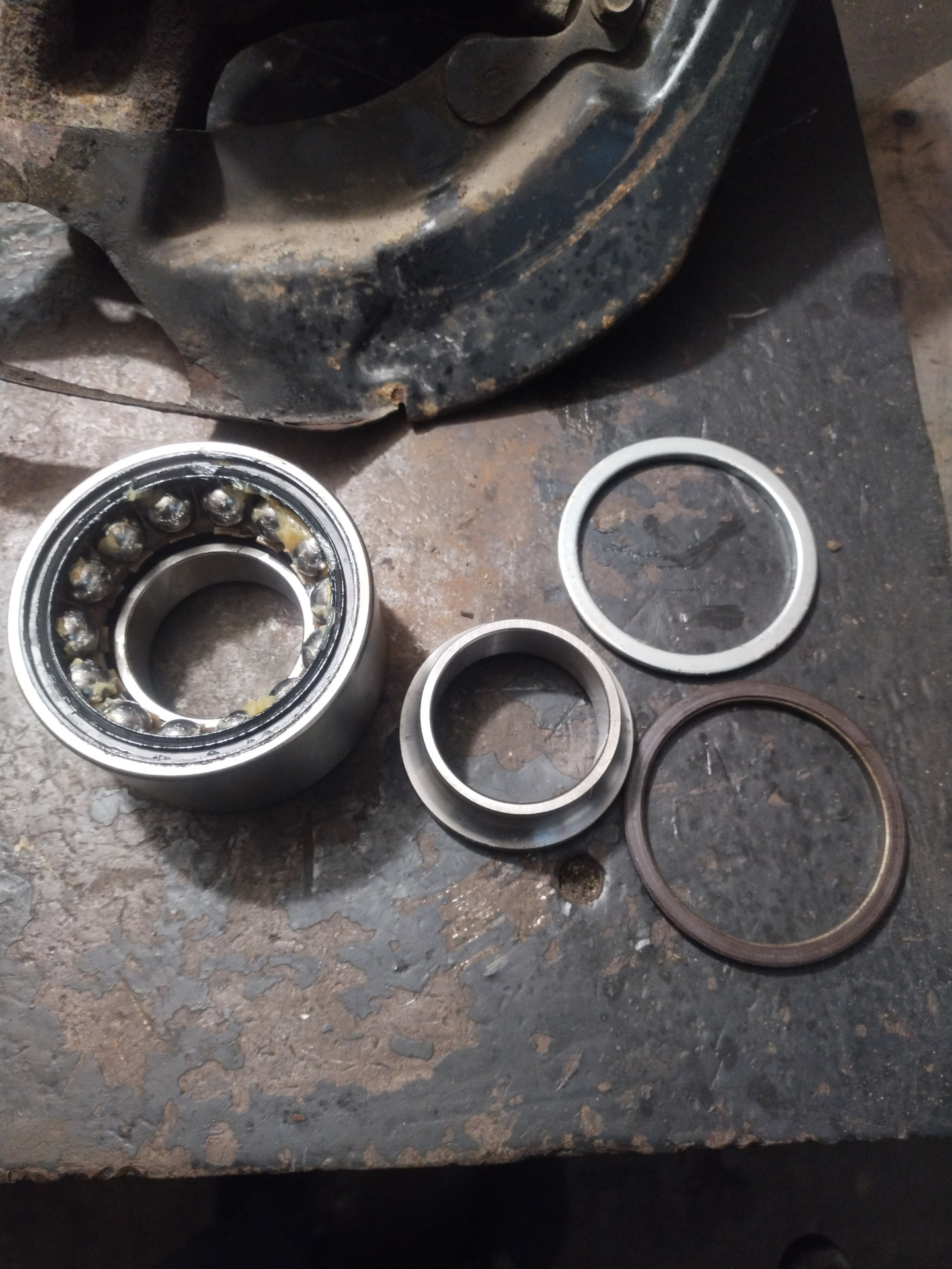 Всем привет! Загудел левый ступичный подшипник, ничего страшного в принципе в этом нет.Заказал фирмы KOYO, но заказ был отменен по не понятным мне причинам и я заказал фирмы ZEKKERT RL1696, это была первая ошибка.Банальная ситуация доставила хлопот на полдня и еще на вторую замену этого же подшипника.Всё шло хорошо, снял колесо и открутил всё что мешает для снятия кулака.Следом выбил гранату из ступицы.
