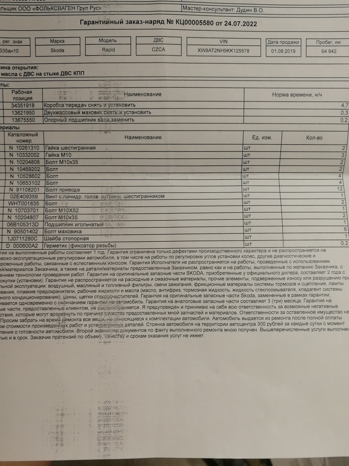 Практически в это же время пришло время делать Т.О на рапид. З.ч — Масло Shell HELIX ULTRA ECT C2/C3 0W-30 4л (до этого дилер лил 5w 40 Original он же лукойл). Считаю густоватым 40ку для турбо мотора, да и гарантию истекает 01.08, поэтому к дилеру ехать нет смысла). Себе в октавия постоянно весь срок эксплуатации авто лили 0w 30, все отлично, ни угара и т.п. Замену сразу расход на рапид в городе снизился (ранее был не менее 7, сейчас порой даже под 6.2). Фильтр воздушный MANN C27009, VAG N0138157 Уплотнительное кольцо, Filtron OP 616/3 Фильтр масляный двигателя. Салонный проехал тыс 5, его пока трогать не стали. Все з.ч приобретались в конце февраля. Ну и т.к пробег перевалил за 60к, нужно было обслужить и коробку. Закуплено: VAG N90414203 Пробка маслозаливной горловины, VAG N10037105, VAG G004000 M2 Жидкость гур "Power Steering Fluid G004", 1л (в мехатроник), VAG G055512A2 Масло трансмиссионное 2л (в мех.часть) — тут пришлось повозиться, т.к смогли привезти только 1л, 2й неумолимо быстро пришлось заказывать везде где можно, чтобы не переплатить, следствие — куча отказов, но все же привезли, правда уже не 1700р как 1й литр. Погнали на Т.О и увидели такую картину: запотевание на стыке коробки и двигателя. И у половины сейчас одна мысль это сальник к.в и стоит он сейчас космос. Оказалось нет. В общем жидкость в коробке трогать не стали, поехали к дилеру, выяснять что к чему. Сделали осмотр, сказали надо снимать коробку смотреть откуда растут ноги, позже заказывать з.ч и устранять запотевание (естественно все БЕСПЛАТНО, гарантийный случай) Записали на опр.день, разобрали, сказали течь из под болтов маховика. Предупредил их сразу, что надеюсь не напиз.ли, под конец то гарантии, а поеду жижи в коробке менять все проверю, им сказал, что просто проверю. Ответ бы утвердительным, что причина именно в них. 10 дней машина стояла разобранная у них, з.ч приехали, все поставили, заменили все болты, игольчатый подшипник, заложили новый герметик, автомобиль забрали. Уже через неделю поехал менять тех.жидкости в коробке, но не к дилеру. Сразу же проверили данное место, на предмет повторного запотевания. Все ок. По итогу слилось где-то 1.3л с мех.части (вечно не доливают гады), масло было немного темноватым, у меня на 45 тыс, когда менял чуть получше было, оно и понятно разница почти в 20 тыс, ну и порядка литра с мехатроника. Залили как и положено по литражу. Позже провели адаптацию. Полет нормальный. Всем добра)