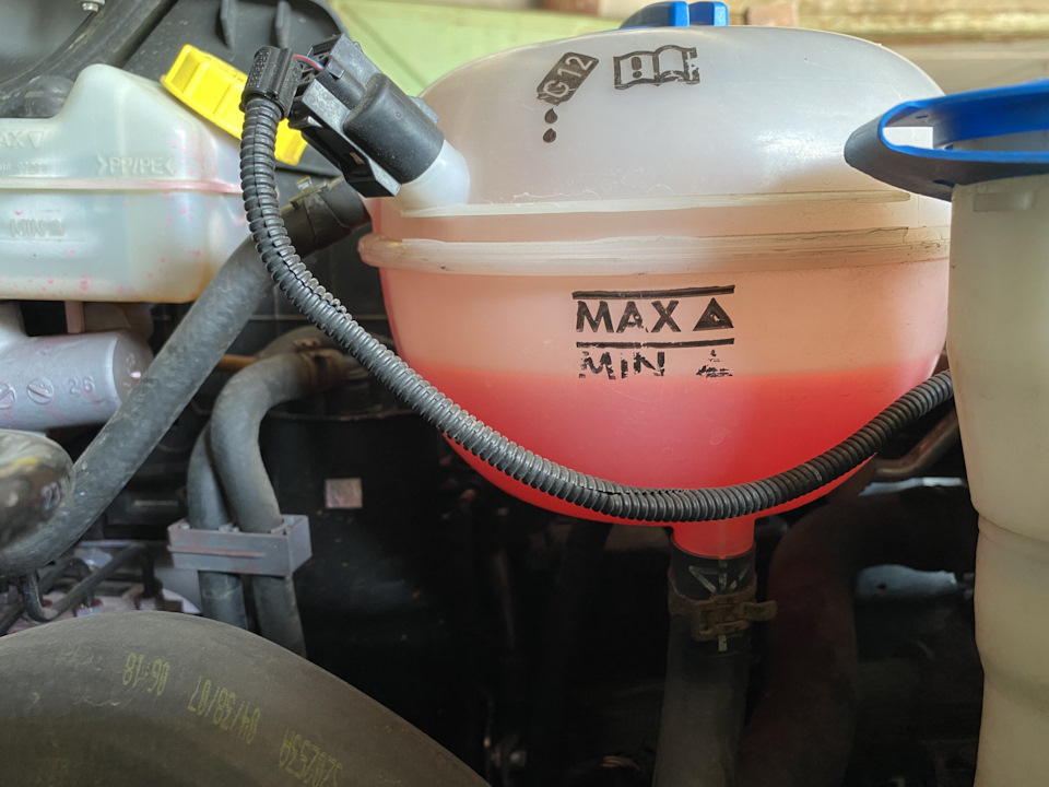 Облазил все- не нашёл. Долил ориентировочно 150-200 гр. до максимума и поехали дальше. Километров через 200 ещё раз проверил — все в норме (как и заливал). А ближе к дому, ещё км. через 400 выдавило снова и опять меньше минимума. 🫣