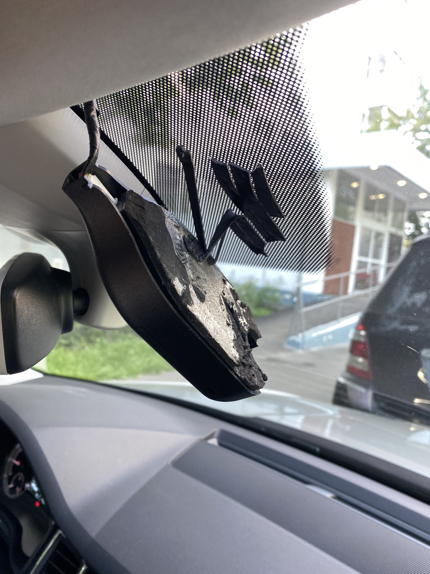 Вчера возникли новые последствия — видеорегистратор отклеился от лобового и повис на проводах, причем видно, что «мастера» даже старый двусторонний скотч не отклеили, а просто к нему несколько полосок тонких другого двухстороннего скотча добавили🤦🏻♂️