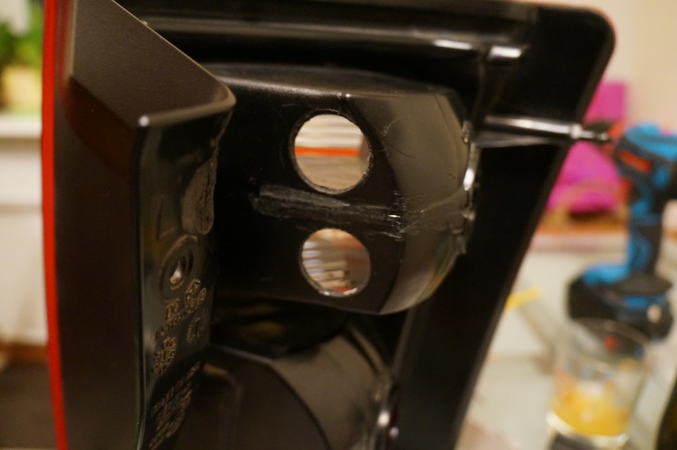 А в самую нижнюю секцию, в катафот, отлично монтируется задний ПТФ. Светильник я делал на трёх 1w красных светодиодах. Результат ОТЛИЧНЫЙ.