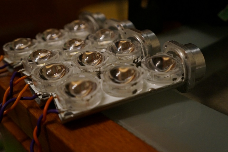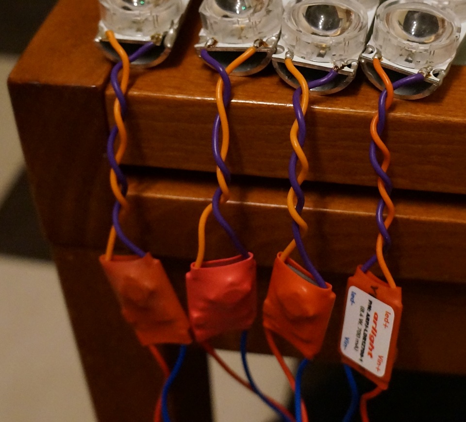 Для тех, кто захочет повторить, я всё-же рекомендую взять оранжевые светодиоды не 1w, а по 3w. Дело в том, что светоотдача оранжевых светодиодов много ниже, чем у белых. Яркости может просто не хватить.