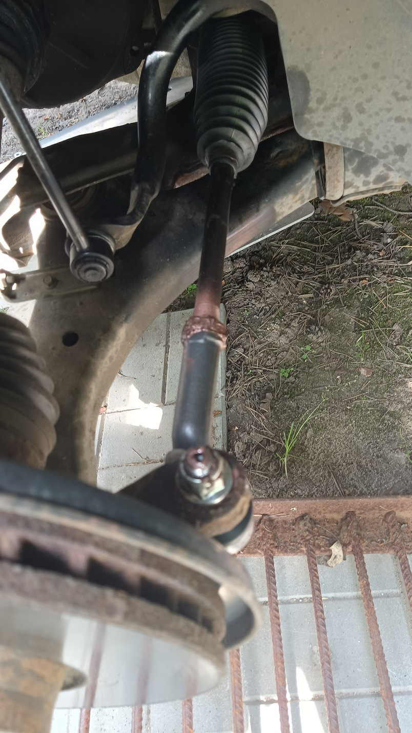 Странный звук заметил еще до отъезда, когда едешь по шершавому асфальту ощущается легкий стук где то в подвеске, но посчитал, что это стойки стаба, которые и заменил. А дальше отпуск и отжиг по грейдеру на 80 км/ч, поскольку на меньшей скорости возникает сильная вибрация и удары в рулевую, дорога то как гребенка после гусениц трактора. А на скорости проходится гораздо легче. Но несколько таких поездок и уже на небольших кочках грунтовки стали раздаваться заметные глухие удары. Пока возвращался домой, эти удары стали проявляться и на неровностях асфальта. По приеду домой не разгружая машину прямо на земле покачал колеса и на левом колесе ощутил заметный люфт. Снял колесо — люфт в рулевой тяге.